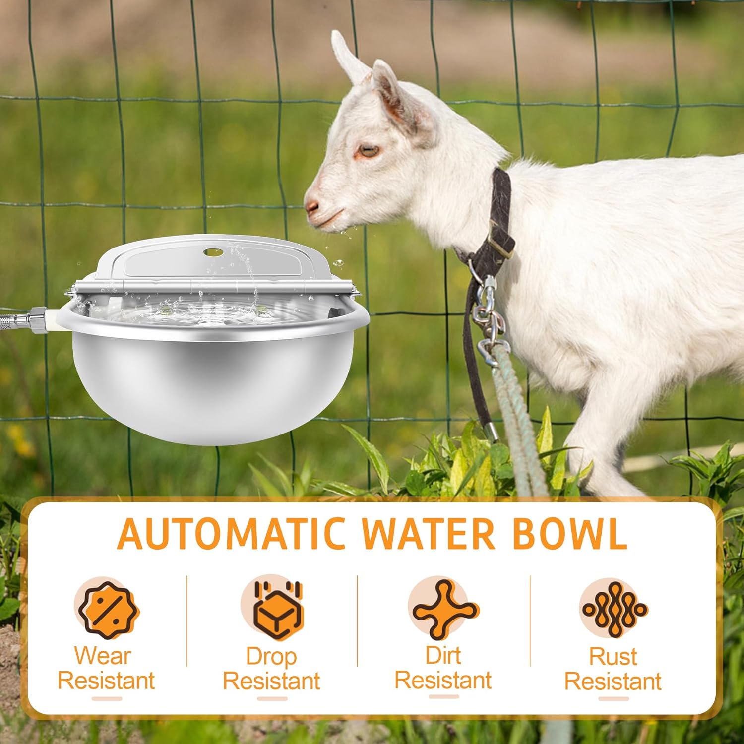 About this item 【Quality Material】Automatic waterer is made of high quality stainless steel material, not easy to rust and deform. Compared to traditional sinks, automatic water bowl is drop proof, dust proof and wear resistant. You can use it for a long time. Except for water bowl, you will also receive 1 hose, 1 water float, 1 adapter and 2 bolts. 【Automatic Design】Automatic animal water dispenser is convenient, saving time and water. Automatic dog water bowl is able to control water intake automatically, keeping enough water. You don't have to replenish water every day. Automatic Dog Waterer has drainage hole, it can reduce sewage and provide a clean drinking environment. 【Working Principle】When water level drops, float drops and spout will open, water will enter automatic horse waterer. When water level rises to set water level, the end of float blocks spout, water stops entering. You can rotate knob of float to adjust highest water level. Position of float higher means more water, lower means less water. 【Easy to Use】Animal drinking water bowl comes with complete accessories and is easy to install. With 2 bolts for fixing water feeder to the wall. With hose and 3/4'' adaptor to fit various faucets. Auto fill dog water bowl with hexagonal drain plug at the bottom, it is easy to unscrew and clean. Tips: Please wear gloves during installation. 【Wide Application】Outdoor dog water dispenser is suitable for indoor and outdoor scenes. Can be used in yards, gardens, farms, living rooms, pet stores, and more. With smooth edges to avoid scratching animal mouths. Stainless steel water bowl is suitable for cows, dogs, chickens, rabbits, ducks, geese, turkeys, livestock and more. 【Warm Tips】Before purchasing, please measure your water pipe size. After receiving our product, you can check whether the related accessories are complete. If bowl is dented due to shipping issues, you can use a rubber mallet to repair it. Any other questions about our products, you can contact us and we will be happy to help you solve the problem. › See more product details