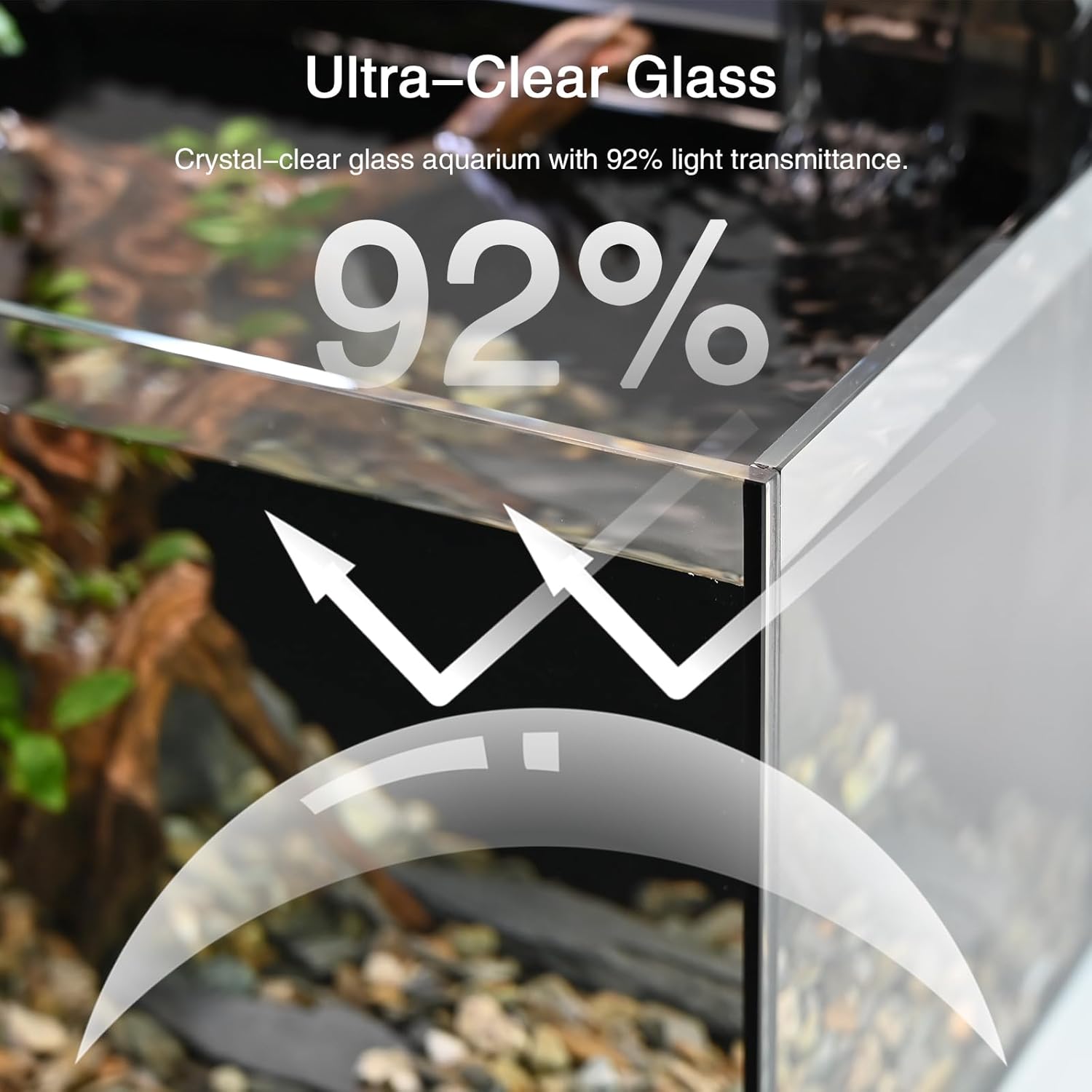 About this item High quality glass fish tank:Ultra-Clear Glass Fish Tank is crafted from 5mm thick ultra-transparent glass, offering exceptional visual clarity. To create a more perfect landscape, this glass aquarium features a black glass background instead of stickers that risk damage and peeling over time. You can enjoy long-term use with confidence. Additionally, the Clear Glass Desktop Fish Tank utilizes high-quality black adhesive, enhancing aesthetics while preventing leaks. Safety Protection:The base of this Nano Nature Aquarium Kit features a meticulously crafted, thick foam pad that provides stability and prevents slipping. It protects both the aquarium surface and your tabletop while minimizing vibrations. For the edges of the Clear Glass Fish Tank, we employ a precision glass-cutting technique with a smaller bevel angle. This results in smoother, rounder edges that prevent finger scratches. Easy to use:Nano NatureAquarium Kit We provide you with a Clear Glass Fish Tank, a wall-mounted waterfall filter complete with filter media for immediate use, and a dedicated aquarium light to add vibrant colors to your aquascape. (Note: For the wall-mounted filter, ensure it is fully installed and filled with water before powering on to prevent dry-running.) Widely Used Clear Glass Fish Tank:This Nature Aquarium Kit makes an ideal gift for beginners or children exploring the underwater world for the first time. The compact Small Fish Tank takes up minimal space and can be placed on your desk, living room table, or kitchen counter. The Clear Glass Fish Tank is perfect for keeping betta fish, goldfish, snails, shrimp, and aquatic plants, allowing you to create any aquatic scene you desire. Clear Glass Desktop Fish Tank Dimensions (11.8 inches long × 7 inches wide × 7.8 inches high) Includes 1 waterfall filter and 1 aquarium light › See more product details
