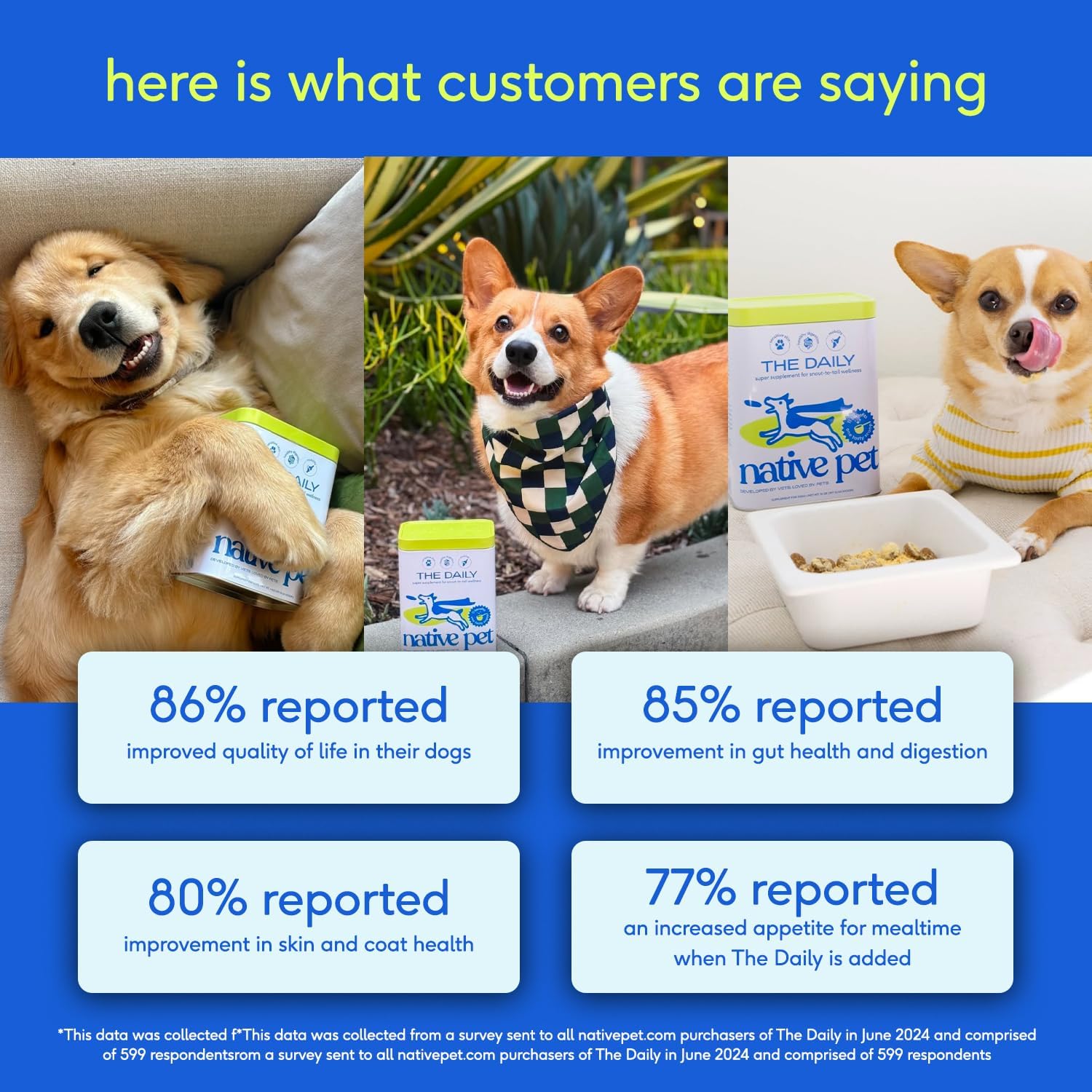 About this item 11-IN-1 DOG SUPPLEMENT FOR FULL-BODY SUPPORT: Expertly formulated dog vitamins that promotes a balanced wellness, supporting mobility, digestion, skin and coat, heart, and cognitive health. Made to nourish every dog, from growing pups to aging companions. HIGH POTENCY POWDER WITH 5X MORE ACTIVES: Unlike most pet vitamins and supplements, this powder delivers 2500mg+ of actives per scoop, 5x more than chews. More nutrients, better absorption. Vitamins for dogs that deliver real results. FAST-ABSORBING NUTRIENTS FOR REAL RESULTS: A powder-based dog vitamin crafted for superior absorption and bioavailability. Smarter supplements for dogs that deliver more benefits with every scoop. CLEAN LABEL WITH FULL TRANSPARENCY: This vitamins for dogs skips the junk. No artificial flavors, starches, or fillers. Every ingredient earns its place for real results. Puppy vitamins and supplements you can actually trust. VET FORMULATED FOR DOGS OF ALL AGES & SIZES: Crafted by a board-certified veterinary nutritionist, this dog powder delivers expert-level care. One scoop a day supports long-term wellness for puppies, adults, and seniors. Itβs smart dog supplements & vitamins, built for every stage of life. PICKY EATER-APPROVED & MANUFACTURED IN THE USA: This vitamin for dogs uses real ingredients like goat milk, pumpkin, and bone broth. No artificial flavors. No off-putting smells. Designed to be a dog supplement even picky eaters enjoy. PROMOTES NORMAL INFLAMMATORY RESPONSE: This dog vitamin powder supports everyday comfort with turmeric and omega-3s. It targets common causes of inflammation to help maintain mobility, tissue health, and overall wellness. Real pet supplements. Real impact. BOOSTS IMMUNE SYSTEM FUNCTION: This dog food supplement for homemade food is packed with antioxidants, essential vitamins, and real nutrients. Itβs a smart way to add pet vitamins that help support a strong immune response all year long. SUPPORTS BRAIN AND HEART HEALTH: This formula blends DHA, taurine, and B vitamins to support focus, memory, and heart function. Itβs made for all life stages, whether you're looking for senior dog supplements or puppy vitamins that do more. SUPPORTS ENERGY UTILIZATION AND VITALITY: This dog daily supplement helps turn food into fuel. It supports stamina, metabolism, and all-day energy, without overstimulation. A smart pick for everyday health, from playful pups to senior dog vitamins that go the distance. Please Note: Packaging may vary due to design changes. Contents remain unchanged in quality and ingredients. Show more βΊ See more product details
