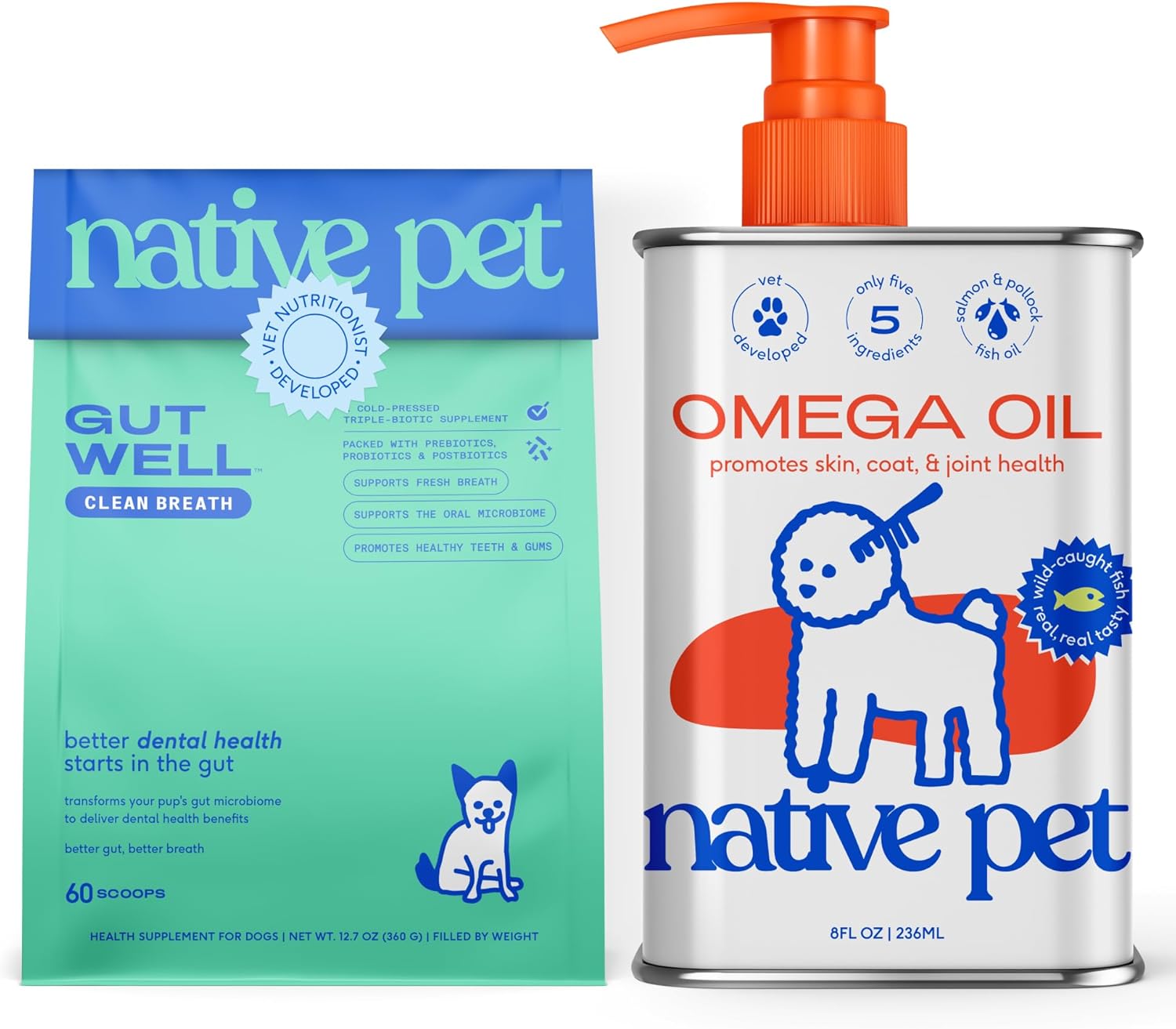 TREATS BAD BREATH AT THE SOURCE: Our pet dental powder's proprietary blend of pre, post and probiotics acts as a powerful dog breath freshener, targeting bad breath from the source to reduce odor, support healthy gums, and deliver real fresh breath for dogs, not just minty coverups. HEALTHY SKIN, COAT AND JOINTS, ALL IN ONE DELICIOUS PUMP: Our Omega 3 for dogs is made from wild Alaskan fish oil, a high-quality dog fish oil supplements that promotes shiny coat, healthy skin, and strong joints. BROWN ALGAE & ZINC FOR TARGETED DENTAL SUPPORT: These powerhouse ingredients team up with our triple-biotic blend to support dog teeth cleaning & break down plaque, fight odor at the source, and support healthy teeth and gums to level up your doggie dental routine. ALL-NATURAL, WILD-CAUGHT FISH OIL: Made with wild-caught pollock oil and wild-caught Alaskan salmon oil, this omega oil for dogs ensures the highest quality and sustainability. We use no added fillers, just pure, premium ingredients to support your pet’s health. VET-NUTRITIONIST FORMULATED: A dog tooth powder crafted by a Board Certified Veterinary Nutritionist, this targeted formula acts as a teeth cleaner for dogs, supporting gum health, fresh breath, and plaque control for a science-backed dog teeth cleaning powder you can trust. › See more product details