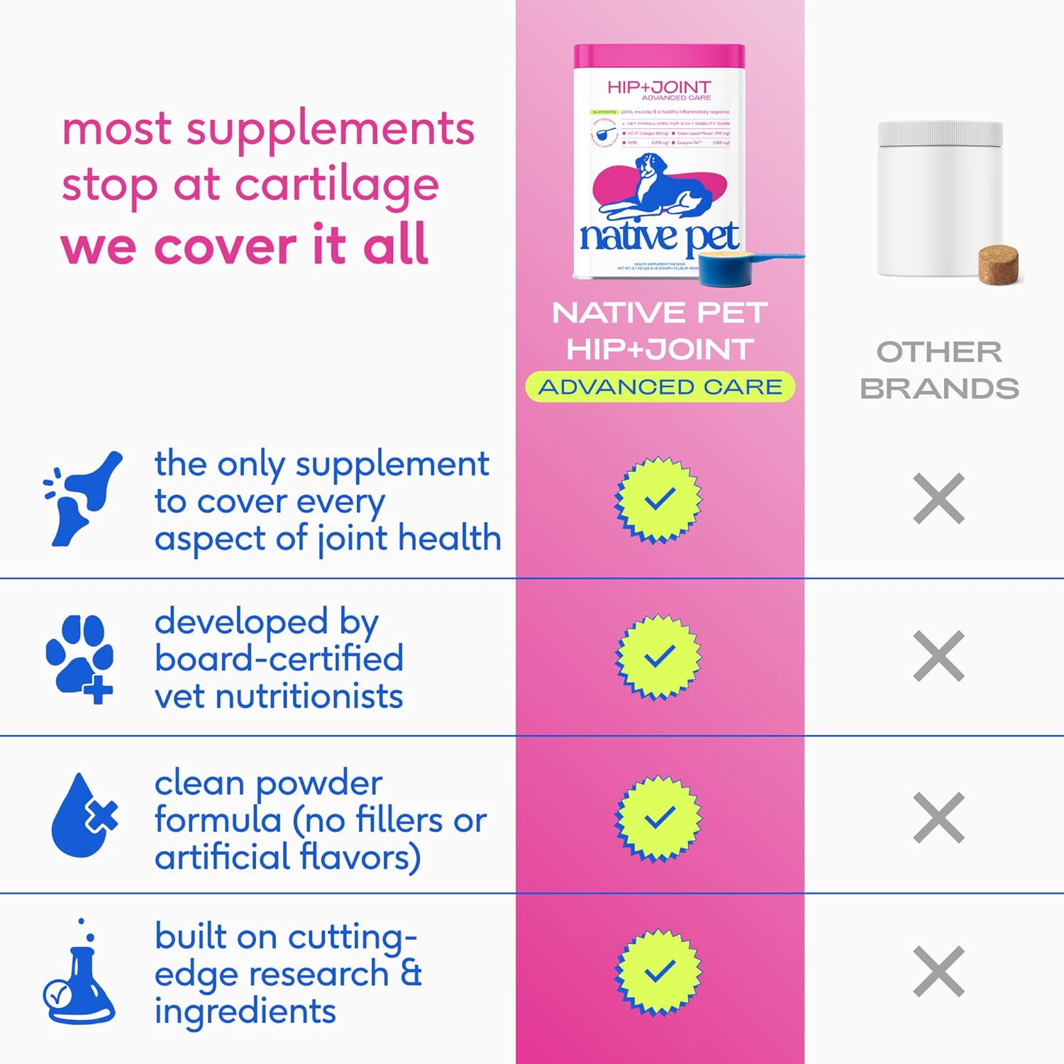Keep your dog moving freely and feeling their best with the Native Pet Joint Health & Daily Wellness Pack — a complete daily duo that supports joint strength, mobility, and overall vitality. This bundle combines our Advanced Joint Support for targeted mobility care with The Daily 11-in-1 Multivitamin for total-body health, delivering comprehensive nutrition for active, aging, or recovering pups. Advanced Joint Support goes beyond standard glucosamine for dogs with a clinically proven formula featuring HMB (Beta-hydroxy-beta-methylbutyrate), UC-II Collagen, Green Lipped Mussel, and Hyaluronic Acid. These powerhouse ingredients protect cartilage, strengthen connective tissues, reduce inflammation, and promote flexibility — helping ease stiffness and discomfort while supporting strong, healthy movement at any age. Paired with The Daily Multivitamin Powder, this pack delivers 11 essential benefits in one scoop. It supports heart, brain, immune, skin, coat, and digestive health while fueling energy and recovery. With 2500mg+ of active ingredients per scoop, this high-potency powder delivers 5× more actives than most chews — ensuring maximum absorption and real results. Formulated by a Board-Certified Veterinary Nutritionist, both formulas feature clean, functional ingredients with no fillers or artificial additives. Proudly made in the USA, this bundle provides science-backed support for strong joints, lean muscles, and whole-body wellness — helping your pup stay happy, healthy, and ready for every adventure.