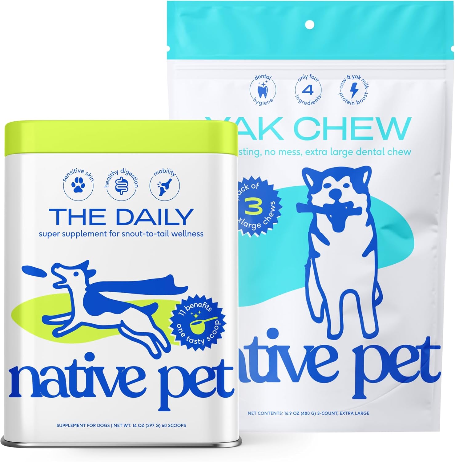 LONG LASTING DOG CHEWS – Keep your furry friend entertained with our yak chews made from natural ingredients like yak's milk, cow's milk, salt, and lime. Perfect for puppies and adult dogs, these yak chews provide hours of chewing fun. IMMUNE SUPPORT & OVERALL HEALTH FOR ALL DOGS: Boost your dog’s natural defenses with this nutrient-rich dog multivitamin powder. Packed with Vitamin C, Zinc, and Beta Carotene, it promotes vitality and overall health, making it the perfect choice for immune support for dogs. Designed for all breeds and all ages, this dog vitamin provides essential dog vitamins and supplements to keep your furry friend active and healthy. PROMOTES DENTAL HEALTH & CLEAN TEETH: This himalayan dog chew helps clean your dog’s teeth as they chew, promoting healthier gums and reducing plaque build-up. Made from simple, natural ingredients like yak's milk, cow's milk, salt, and lime, these yak chews for dogs are designed to strengthen your dog's teeth and maintain oral hygiene. Great for maintaining clean, healthy teeth, our himalayan yak cheese dog chew offers a natural, long-lasting chewing experience. IRRESISTIBLE FLAVOR DOGS LOVE: 100% of dogs in taste tests preferred this beef bone broth and goat milk-based formula over leading competitors. Designed for maximum palatability, this pet supplement doubles as a dog food topper, making it perfect for picky eaters. Whether it’s used as a treat for small breeds or a meal enhancer for large dogs, your furry friend will enjoy every bite. ALL NATURAL, VET APPROVED & EASY TO DIGEST: Our yak dog chews are made with simple, natural ingredients that are vet approved, offering a highly digestible alternative to rawhide. Native Pet Yak Chews are gentle on your dog's stomach, even for those with sensitive digestive systems. The natural ingredients in these yak bones for dogs ensure your dog enjoys hours of safe, satisfying chewing without the discomfort of traditional chews. › See more product details