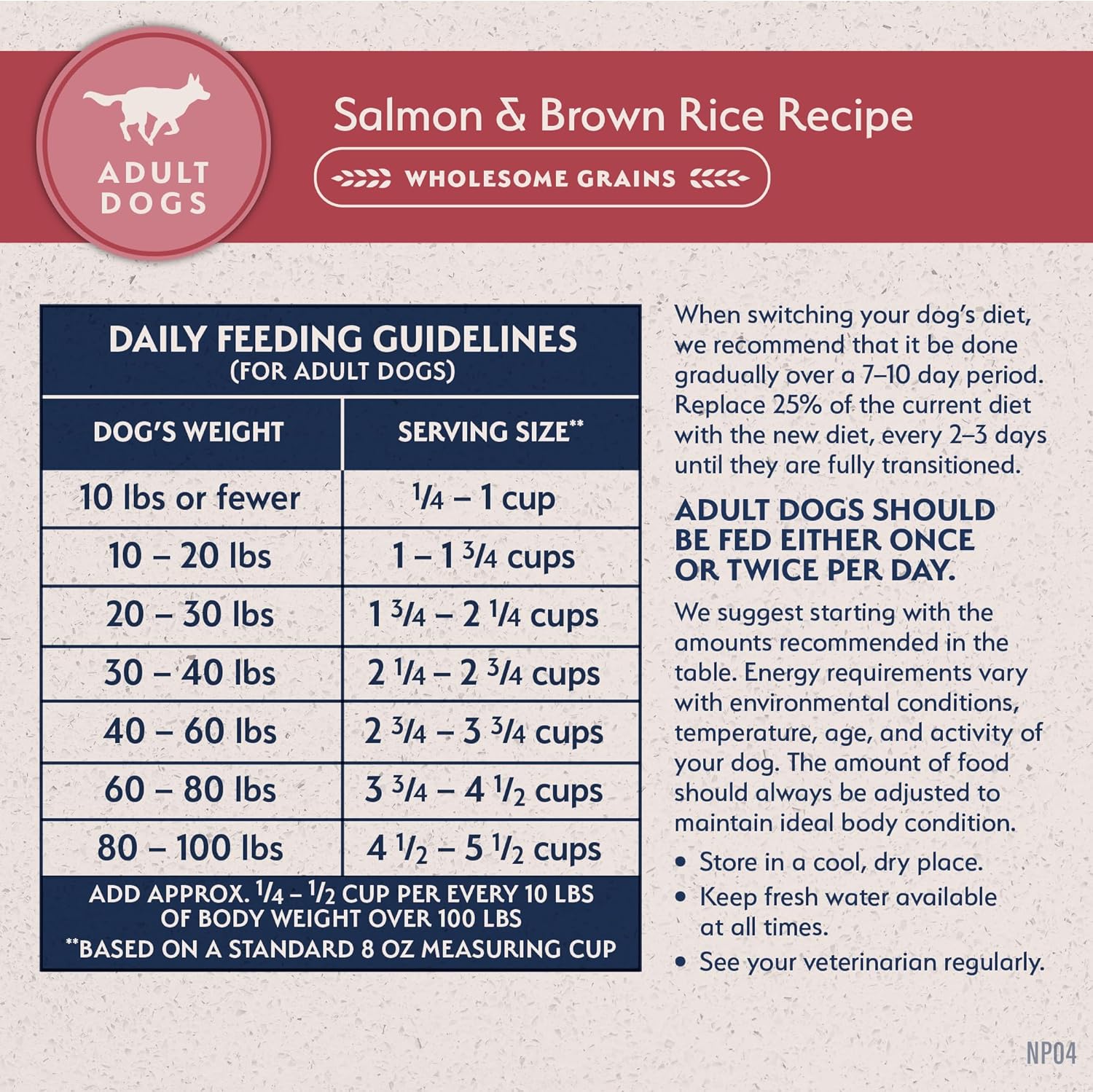 - Directions: Adult Maintenance DAILY FEEDING GUIDELINES (for adult dogs over 12 months) Weight of Adult Dog (lbs) Serving Size Up to 10 1 cup* 10-20 1 - 1 1/2 cup* 20-30 1 1/2 - 2 1/4 cup* 30-40 2 1/4 - 2 3/4 cup* 40-60 2 3/4 - 3 3/4 cup* 60-80 3 3/4 - 4 1/2 cup* 80-100 4 1/2 - 5 1/2 cup* *Standard 8-ounce measuring cup The amounts in the table are intended as guidelines only. The food intake should be adjusted according to the age, weight, breed, temperature, climate and activity level of your dog. Consult a veterinarian for specific weight recommendations. Adult dogs should be fed either once or twice per day. When you first start feeding Natural Balance® L.I.D. Limited Ingredient Diets® Salmon & Brown Rice Dry Dog Formula, we suggest starting with the amounts recommended in the table. Energy requirements vary with environmental conditions, temperature and activity of your dog. The amount of food should always be adjusted to suit your dog's needs. Keep clean water available at all times Dick Van Patten's Natural Balance® L.I.D. Limited Ingredient Diets® Salmon & Brown Rice Formula Adult Dog Food is formulated to meet the nutritional levels established by the Association of American Feed Control Officials (AAFCO) Dog Food Nutrient Profiles for Adult Maintenance.