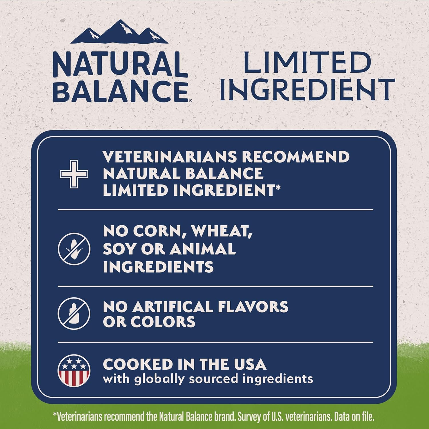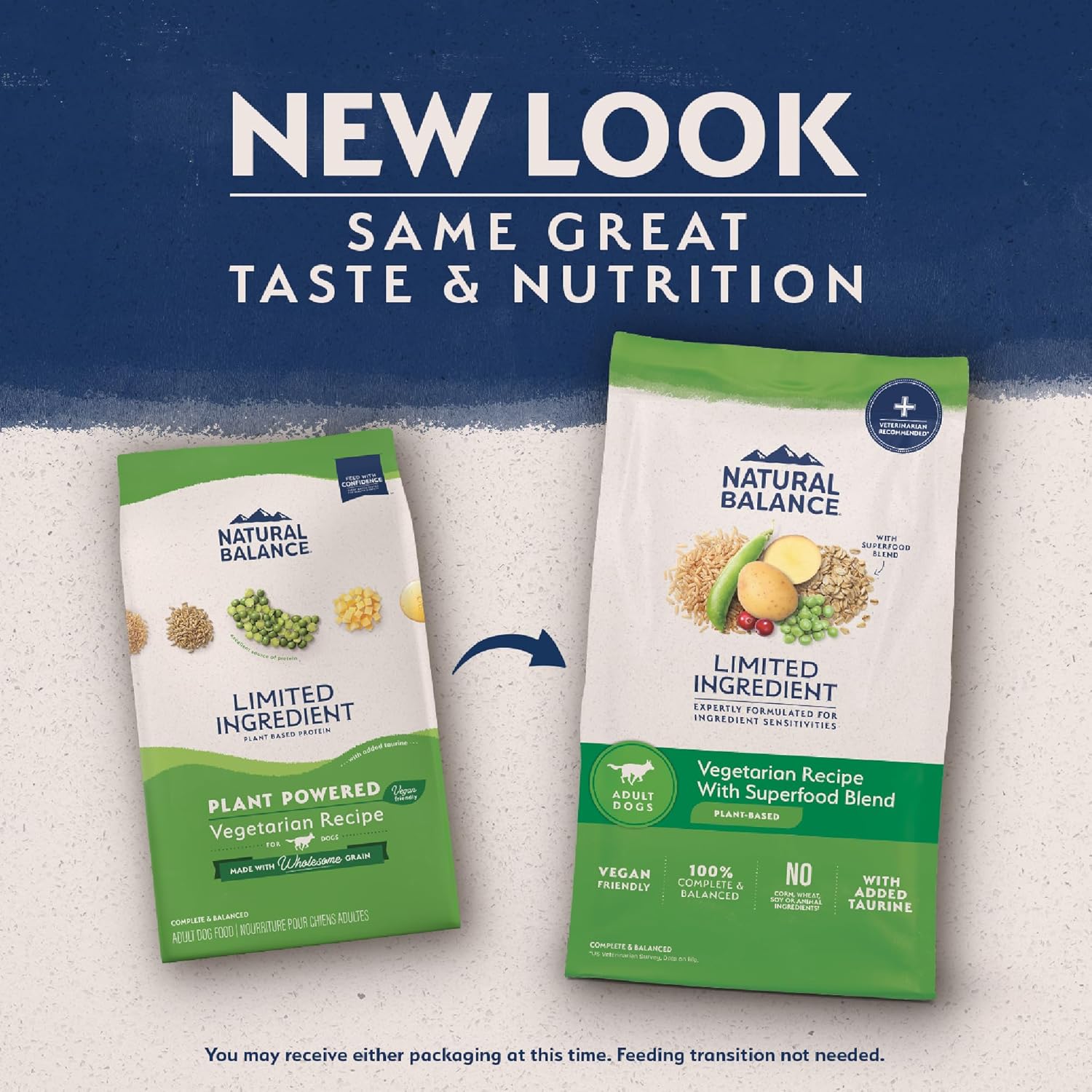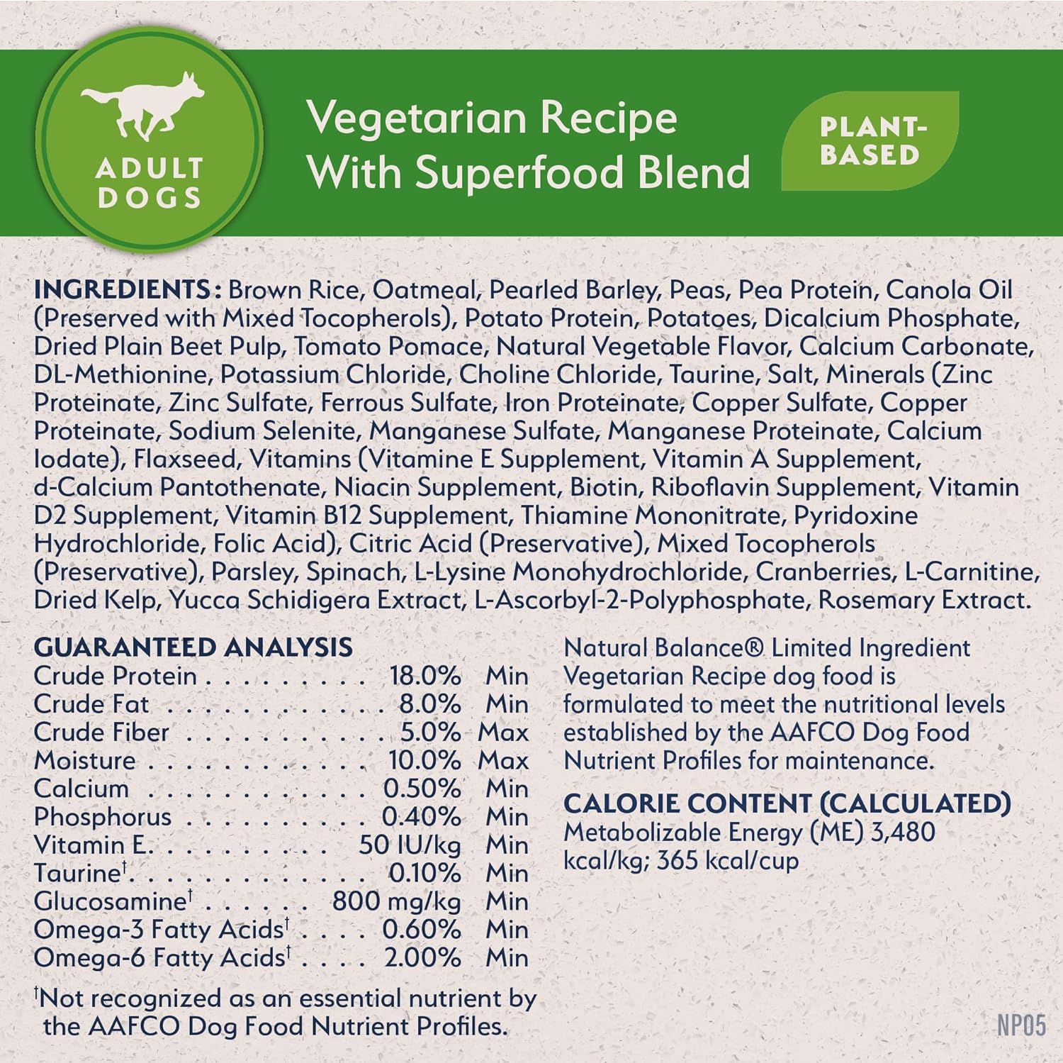 Natural Balance Limited Ingredient helps dogs with ingredient sensitivities live happy, healthy lives. Our Vegetarian Recipe With Superfood Blend is a complete and balanced vegetarian dog food made with peas as a plant-based protein source, plus a nutrient rich blend of brown rice, potatoes, cranberries, and oatmeal. Balanced omega fatty acids support healthy skin and a shiny coat, while protein and fiber support easy digestion, making it a gentle option for a sensitive stomach dog food. Formulated without animal protein, corn, wheat, soy, or artificial flavors and colors, this recipe provides premium nutrition as a wholesome alternative to a meat based diet. That is why it is a trusted vet recommended dog food for dogs with ingredient sensitivities.