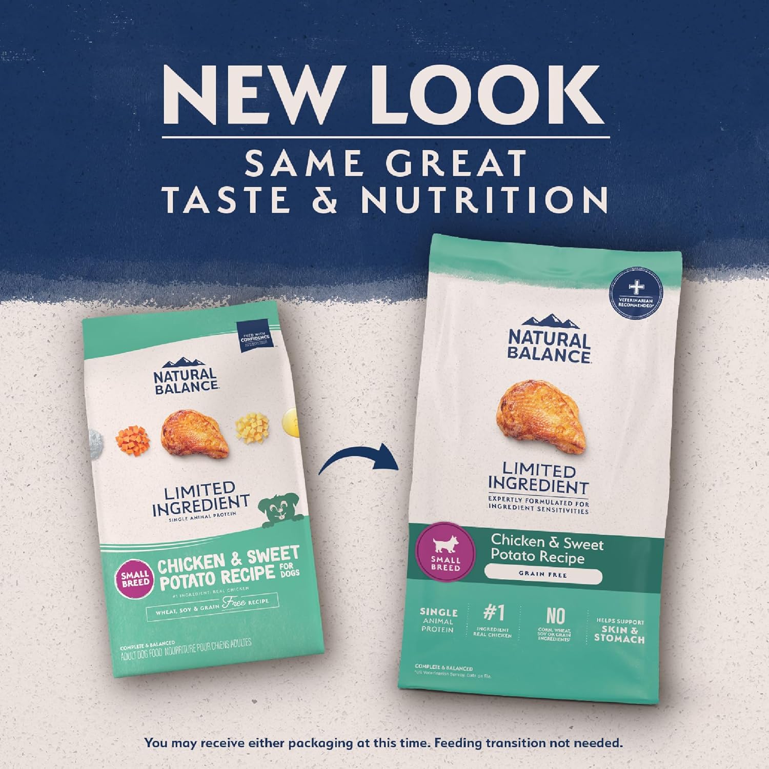 Natural Balance Limited Ingredient helps dogs with ingredient sensitivities live happy, healthy lives. Our Chicken & Sweet Potato Small Breed Recipe features Real Chicken as the #1 ingredient and a single source of animal protein to support healthy skin and a shiny coat. Fiber-rich sweet potatoes promote easy digestion, making this grain free dry dog food a gentle and balanced sensitive stomach dog food. Our grain free dry dog food is made with smaller bites to fit small jaws and teeth, the crunchy texture helps promote clean teeth and healthy gums. Formulated without corn, wheat, soy, or grains, and free from artificial flavors or colors, this premium recipe is a vet recommended dog food for dogs with ingredient sensitivities.