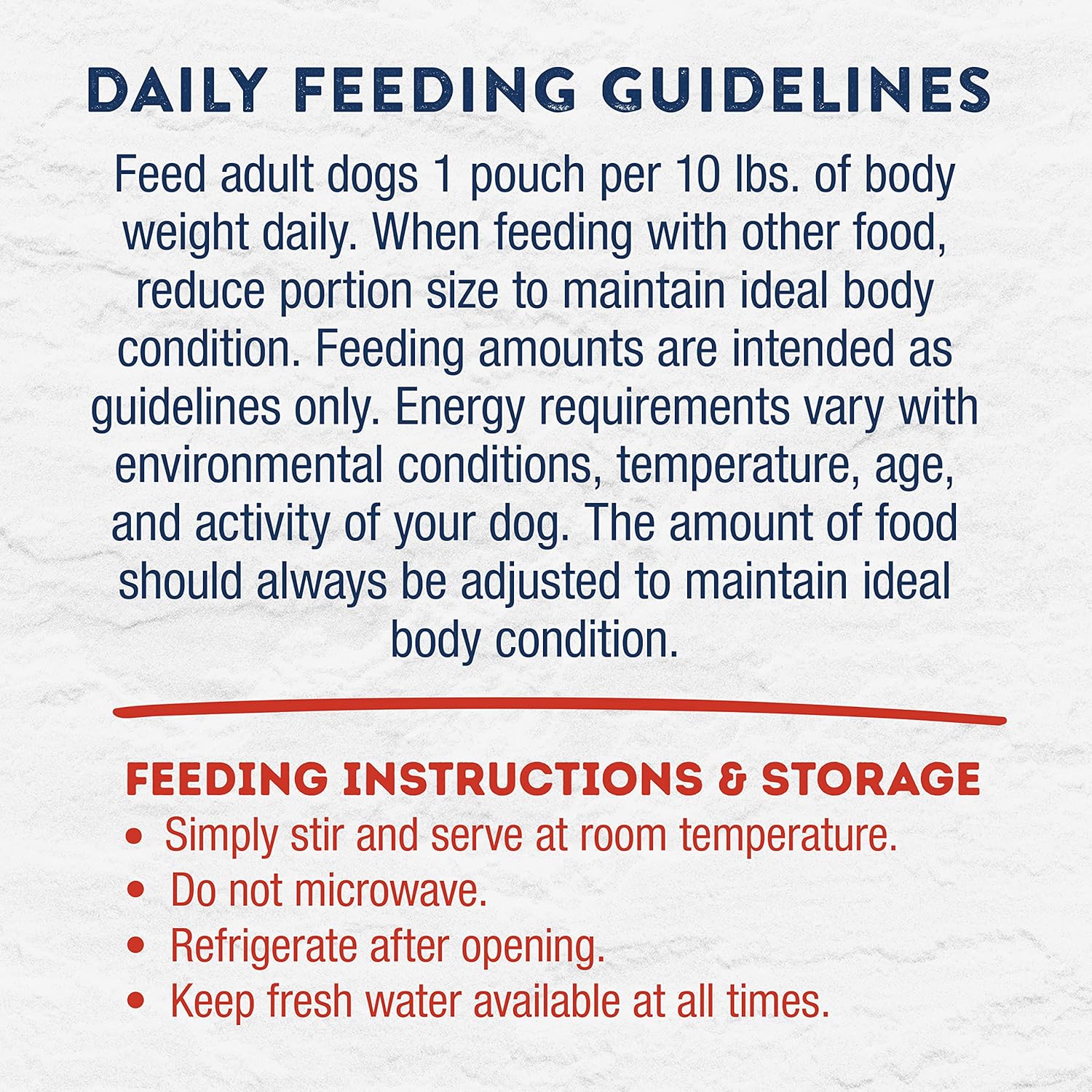 - Directions: Daily Feeding Guidelines Feed adult dogs 1 pouch per 10 pounds of body weight daily. Intended as guidelines only. The food intake should be adjusted according to the age, weight, breed, climate, and activity level of your dog.