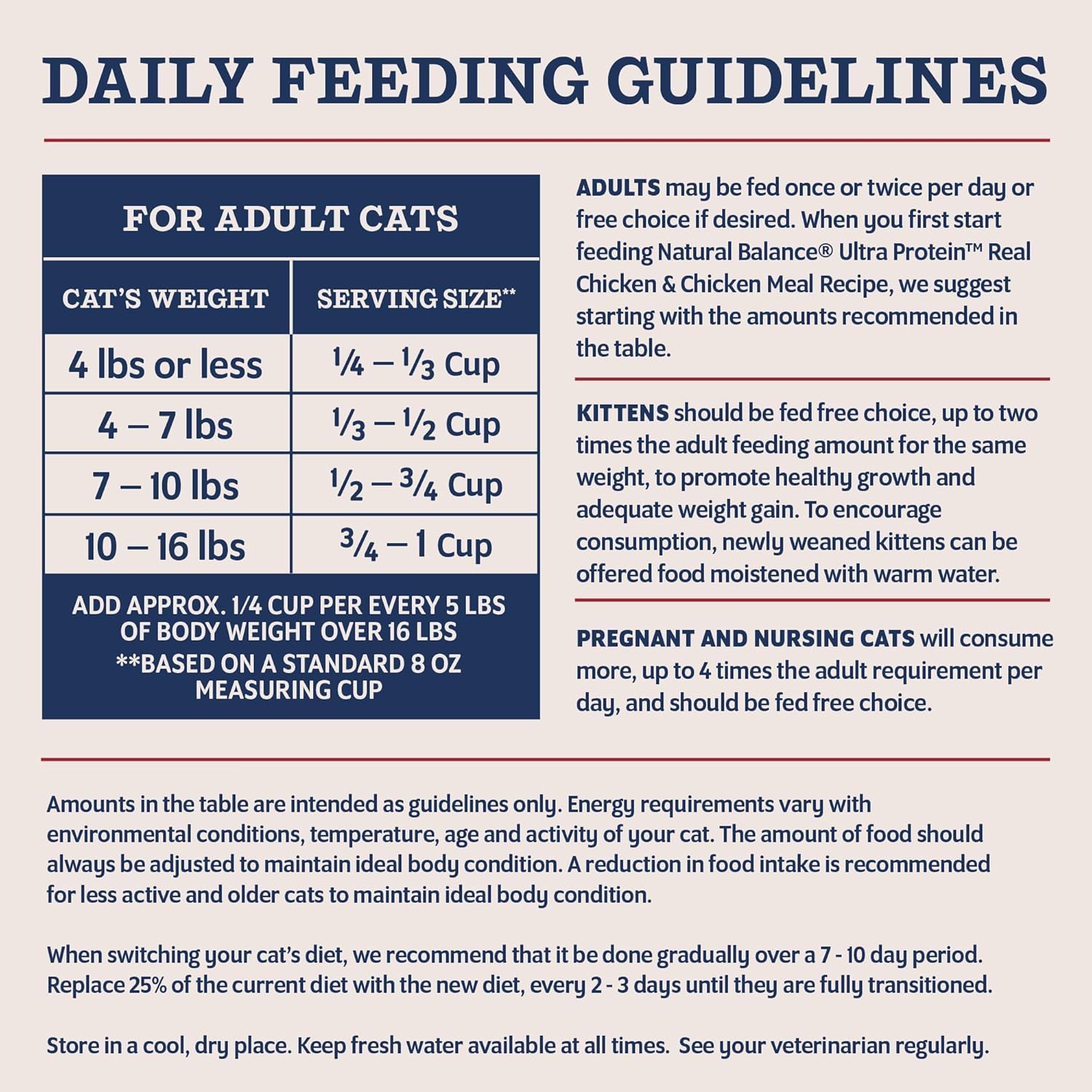 - Directions: Daily Feeding Guidelines (For Adult Cats) CAT'S WEIGHT SERVING SIZE* 4lbs or less 1/4 - 1/3 Cup 4- 7 lbs 1/3 - 1/2 Cup 7- 10 lbs 1/2 - 3/4 Cup 10-16 lbs 3/4 - 1 Cup Add Approx. 1/4 Cup per Every 5 lbs of Body Weight over 16lbs *Based on Standard 8oz measuring cup