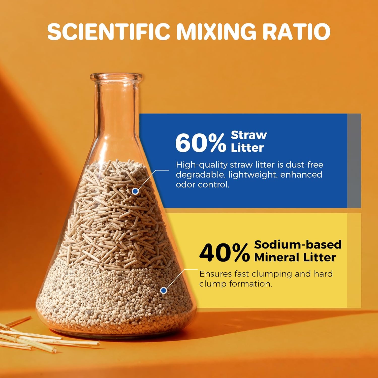 About this item 【Protects Cat's Respiratory Health】Our natural cat litter made from food-grade straw fibers with no chemicals,artificial fragrances,or binders.Lightweight and low-dust formula keeps the air clean,making it ideal for sensitive cats and kittens 【Dual Formula&Fast Clumping】Our clumping cat litter addresses the pain points of using a single type of bulk cat litter but also integrates the advantages of both.The mineral cat litter provides instant liquid lock,while the straw fibers reinforce the structure to prevent breakage,easy scooping every time 【Low Dust&Low Tracking】Scientifically proportioned selected straw and premium sodium-based mineral litter.Through a multi-stage dust-removal process,our dust free cat litter achieve a 99% dust-free formula,significantly reducing airborne and dust protecting both your cat's and your family's respiratory health 【Say Goodbye to Sticky Litter Box】Our innovative blend mixes natural straw pellets with sodium-based mineral litter.Low tracking cat litter that light weight straw creates a loose, breathable "isolation layer" at the bottom of the box,effectively preventing wet litter from directly sticking to the surface for easy scooping and a cleaner litter box 【Super Absorbent&Lasts Longer】Thanks to the scientific ratio of our straw and sodium-based mineral litter.Our mixed cat litter absorbs 3x more liquid than traditional clay litter.You need less per use for solid cat litter clumping,making each bag last significantly longer and saving you from frequent changes 【100% Natural Straw for Odor Control】The porous structure of natural straw effectively traps odors and enhances airflow within the litter box.This not only keeps your home fresher but also allows the multi cat litter to dry quickly and perform efficiently,contributing to its longevity › See more product details