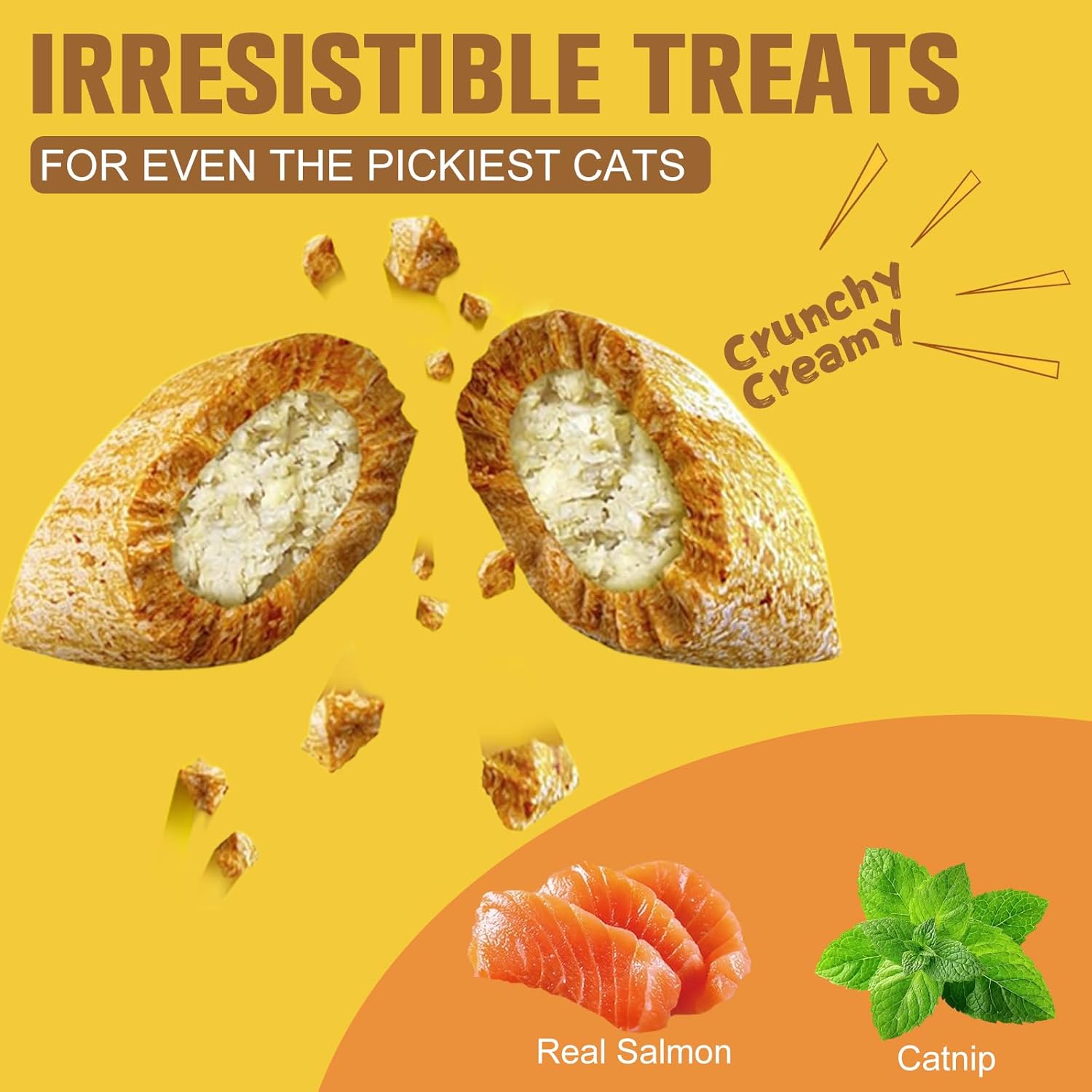 About this item REAL SALMON & CATNIP FLAVOR: These catnip treats feature real salmon as a key ingredient plus catnip, delivering an irresistible savory taste that cats crave, paired with natural ingredients for wholesome cat treats healthy nutrition CRUNCHY OUTSIDE & SOFT INSIDE: Dual-texture crunchy cat treats with a crispy outer shell and creamy inner center, acting as cat teeth cleaning treats to reduce tartar while satisfying your feline’s texture preference NATURAL INGREDIENTS WITH ESSENTIAL NUTRIENTS: Made with natural ingredients enriched with taurine and vitamin E, these cat treats healthy options provide balanced nutrition to support your cat’s overall well-being SUITABLE FOR CATS OVER 3 MONTHS: Ideal for adult cats and kittens over 3 months old, these catnip treats work perfectly as daily snacks, training rewards or meal toppers to add flavor to your pet’s diet CONVENIENT RESEALABLE TUB: Comes in an airtight tub that locks in freshness for crunchy cat treats, ensuring easy storage and keeping the cat teeth cleaning treats crisp and flavorful between uses › See more product details