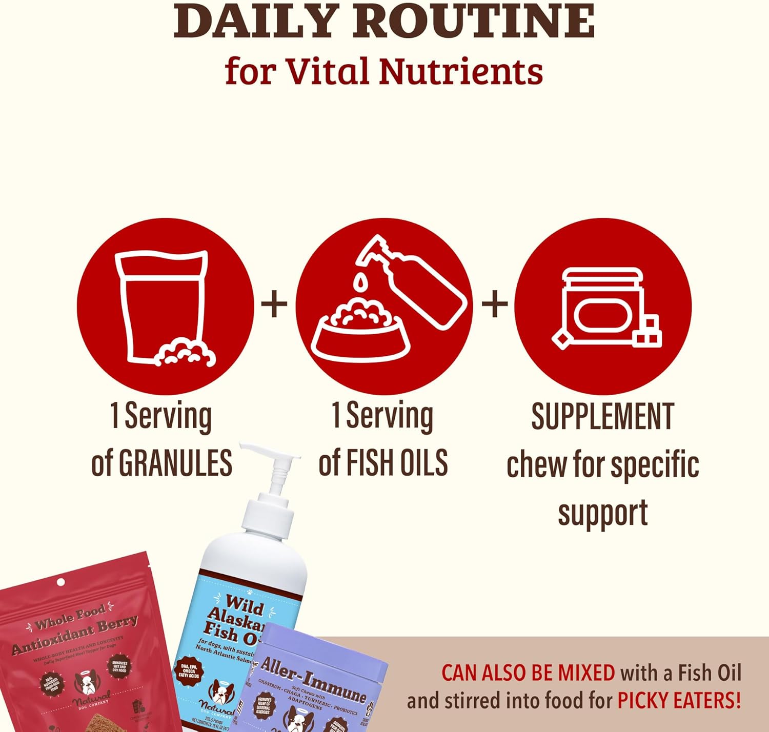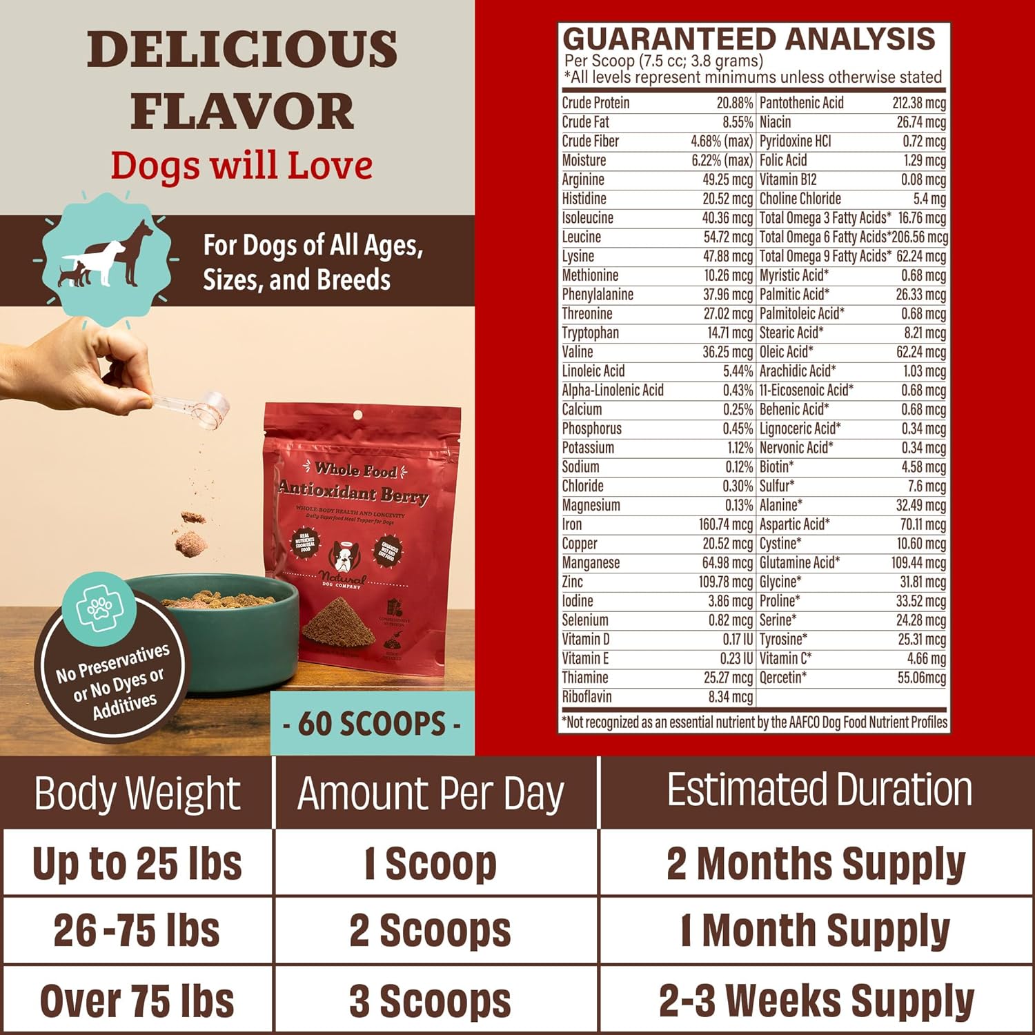 About this item POWERFUL ANTIOXIDANT FOR A HEALTHIER DOG: Is your dog not getting the full benefits from their daily meals? Transform their meals with our Antioxidant Berry Granules, a nutrient-dense dog food topper that fights free radicals, supporting your dog's overall well-being. Go beyond generic with a topper that provides superior nutrition, helping your dog live a vibrant, active life. ANTIOXIDANT-RICH SUPERFOOD: Our Antioxidant Berry Granules features a powerful blend of blueberries, cranberries, raspberry, strawberry, and blackberries that work synergistically to enhance your dog’s immune system, protect their skin, and ensure a lustrous, healthy coat. Packed with natural vitamins and minerals, this dog health booster provides holistic nutrition with every meal, supporting your dog’s overall well-being. REAL FOOD, REAL HEALTH, COMPLETE NUTRITION: Elevate your dog’s diet with our Antioxidant Berry Granules, packed with over 60 essential nutrients from real foods. They’re a complete source of essential nutrients like vitamins, minerals, and amino acids derived from real fruits, ensuring overall wellness. This dog superfood supplement promotes immune support, healthy skin, and a shiny coat, making it the ultimate choice for holistic dog nutrition. SUPPORTS AGING DOGS WITH ANTIOXIDANTS: Senior dogs require specialized care that general multivitamins can't provide. Our Antioxidant Berry Granules are rich in antioxidants that protect aging cells, strengthen the immune system, and promote joint health and cognitive function, giving your older dog the focused support they need to live a vibrant, healthy life. WET OR DRY, LOVED BY PICKY EATERS: Naturally flavored with the taste of real berries, our Antioxidant Berry Granules are highly palatable, making them irresistible to dogs, even picky eaters. Ideal for wet or dry food, they retain moisture to prevent dry mouth and can be rehydrated with cold water without losing any nutritional benefits. This versatile dog food topper enhances both flavor and nutrition. COMPLETE NUTRITION FOR YOUR DOG'S WELLNESS: For a truly comprehensive approach, combine with our Ultra Omega Oil and Skin & Coat Chews to create a full-spectrum diet regimen that nourishes skin, promotes a shiny, healthy coat, and supports immune function, joint health, and cognitive well-being. EASY TO USE FOR DAILY NUTRITION: Our Antioxidant Berry Granules are simple to incorporate into your dog’s diet. Just sprinkle the recommended amount over their wet or dry food at each meal. Just sprinkle 1 scoop daily for dogs under 25 lbs, 2 scoops for dogs between 25 and 75 lbs, and 3 scoops for dogs over 75 lbs over their wet or dry food. › See more product details