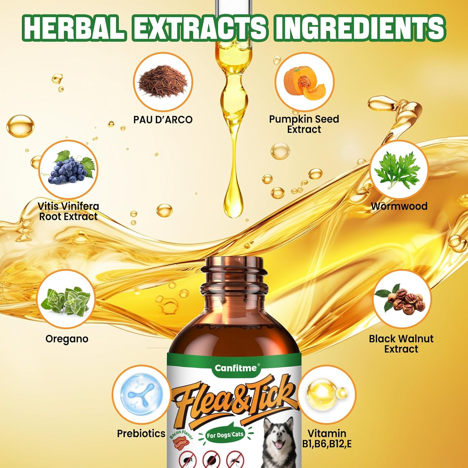About this item Natural Oral Flea and Tick Prevention for Dogs and Cats: This gentle plant-based formula includes Pumpkin Seed Extract, oregano, Vitis Vinifera Root Extract, and Muti-Vitamins that It's an effective, natural alternative to collars, sprays, and shampoos, providing daily protection from fleas and ticks Easy-to-Use Oral Drops with Bacon Flavor: Say goodbye to feeding struggles! These oral flea treatment for cats and dogs feature an irresistible bacon flavor. Simply add the liquid drops to your pet's food or directly into their mouth for a stress-free experience that they'll love, making daily protection effortless Supports Overall Health With Multivitamins & Prebiotics: Beyond Fleas, Ticks Control, This Supplement Promotes Vitality. It Includes Multivitamins And Prebiotics To Aid Digestion, Maintain A Healthy Skin And Coat, And Support Your Pet's Overall Immune System, Helping Them Stay Comfortable And Energetic Through Every Season Precisely Measured Doses for All Breeds & Ages: This cat flea and tick solution is suitable for pets of all sizes and life stages, from kittens and puppies to senior cats and dogs. The included dropper with clear markings ensures accurate dosing based on weight (under 10 lbs, 10-35 lbs, over 36 lbs) Gentle Start & Natural Build-Up: Remember, this is a natural supplement that builds effectiveness over time. For optimal cat flea and tick protection, we recommend consistent daily use for 1-2 weeks. For first-time use, start with half the dose mixed into food, then gradually increase to the full recommended amount. This allows your pet's system to adjust comfortably for lasting results › See more product details
