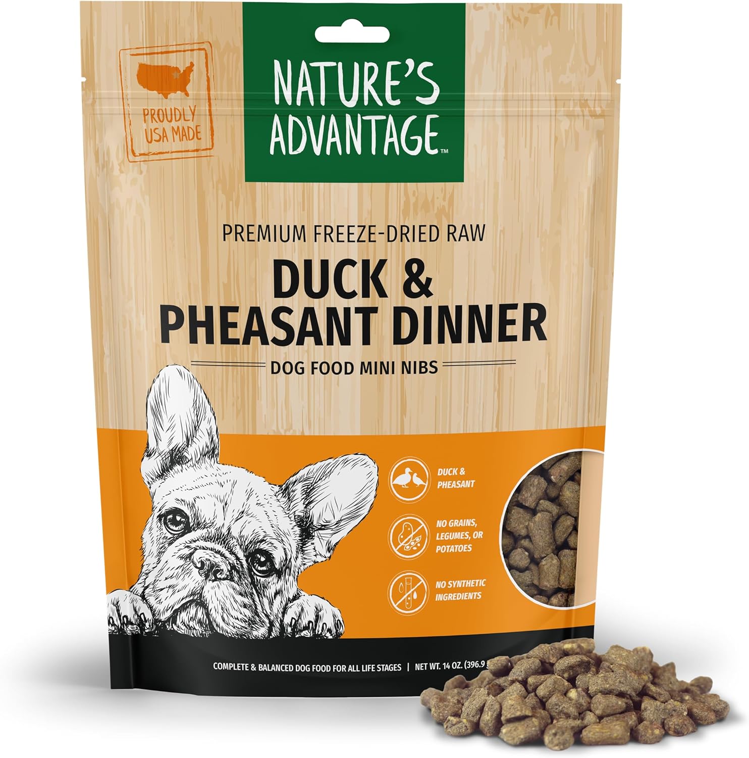 WHAT’S THE ADVANTAGE? Here at Nature’s Advantage, we make healthy dog food you’ll be proud to serve to your favorite canine! This grain free dog food is made from high quality duck and pheasant. Lean protein promotes a trim figure, superior energy, and a gleaming coat, while fresh fruits and veggies provide all the healthy nutrients your best friend needs. Feed this freeze-dried duck and pheasant dinner as a complete and balanced meal, or sprinkle some into your dog's usual food for an added boost of hearty nutrition. Because our freeze-drying process does not use high heat, more of the meat's and veggie's naturally-occurring vitamins and nutrients are retained. That makes this freeze-dried dog food healthier and easier to digest than canned food or kibble. It’s dog food made the smart way — because we know your clever pup deserves the best!
