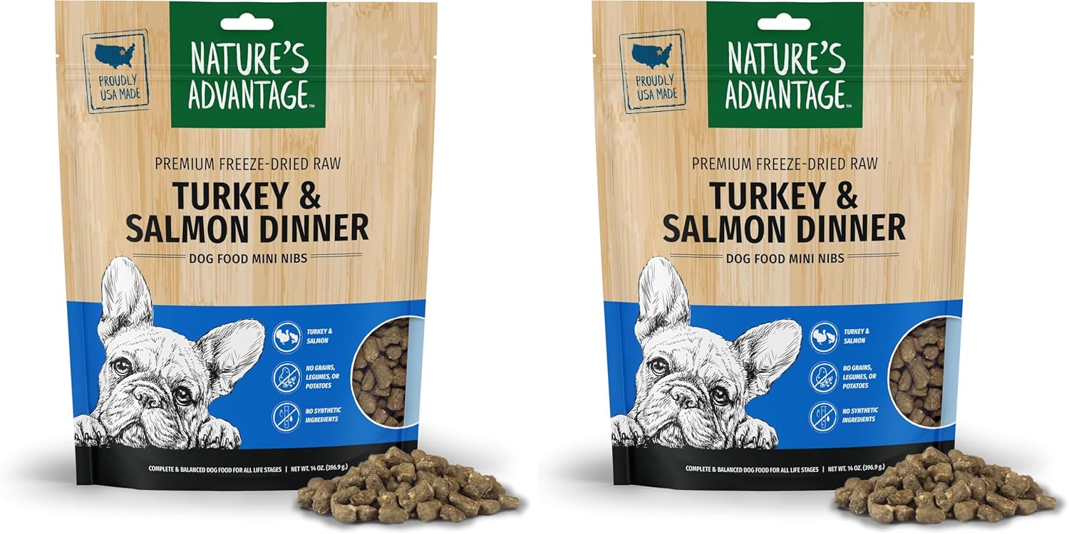 About this item The information below is per-pack only GRAIN FREE, GLUTEN FREE FOOD: That’s right, this all-natural freeze dried grain free dog food is so good, so healthy and so tasty. A simple low carb raw dog food loaded with protein to support wellness. ALWAYS USA MADE: Nature's Advantage dog food and treats are made in America using our proprietary and exclusive freeze-drying process. Unlike many other brands, we own and operate our own facilities in the American Midwest, allowing us to maintain the nutrition, quality, and flavor that smart dogs expect from Nature’s Advantage. CLEAN INGREDIENTS: Check the label, you'll love what you see. Your dog will love what they taste. A limited ingredient, gluten free freeze dried raw dog food with no fillers or artificial ingredients. Just an all-natural dog food made with real turkey, salmon, vegetables and fruit. SERVE AS A MEAL, TREAT OR MIX-IN TOPPER: Serve as a dry dog food or add to kibble as a healthy dog food mix-in or topper. You’ll feel good feeding Nature's Advantage Freeze Dried Raw Dog Food and your dog will be excited for every dinner. With all that nutritious energy, go ahead and wag that tail! WHY FEED RAW: Because our single source proteins, fruits and veggies remain in a raw form that is naturally easy on your dog’s digestive system, a healthy freeze-dried raw diet results in many health benefits. Our Nature’s Advantage pet parents have seen their best pals find relief from food allergies and digestive distress, as well as maintain a healthier weight and have more energy day-to-day. You're not spoiling your pet; you're feeding them what they were meant to eat. › See more product details