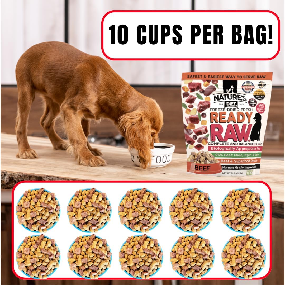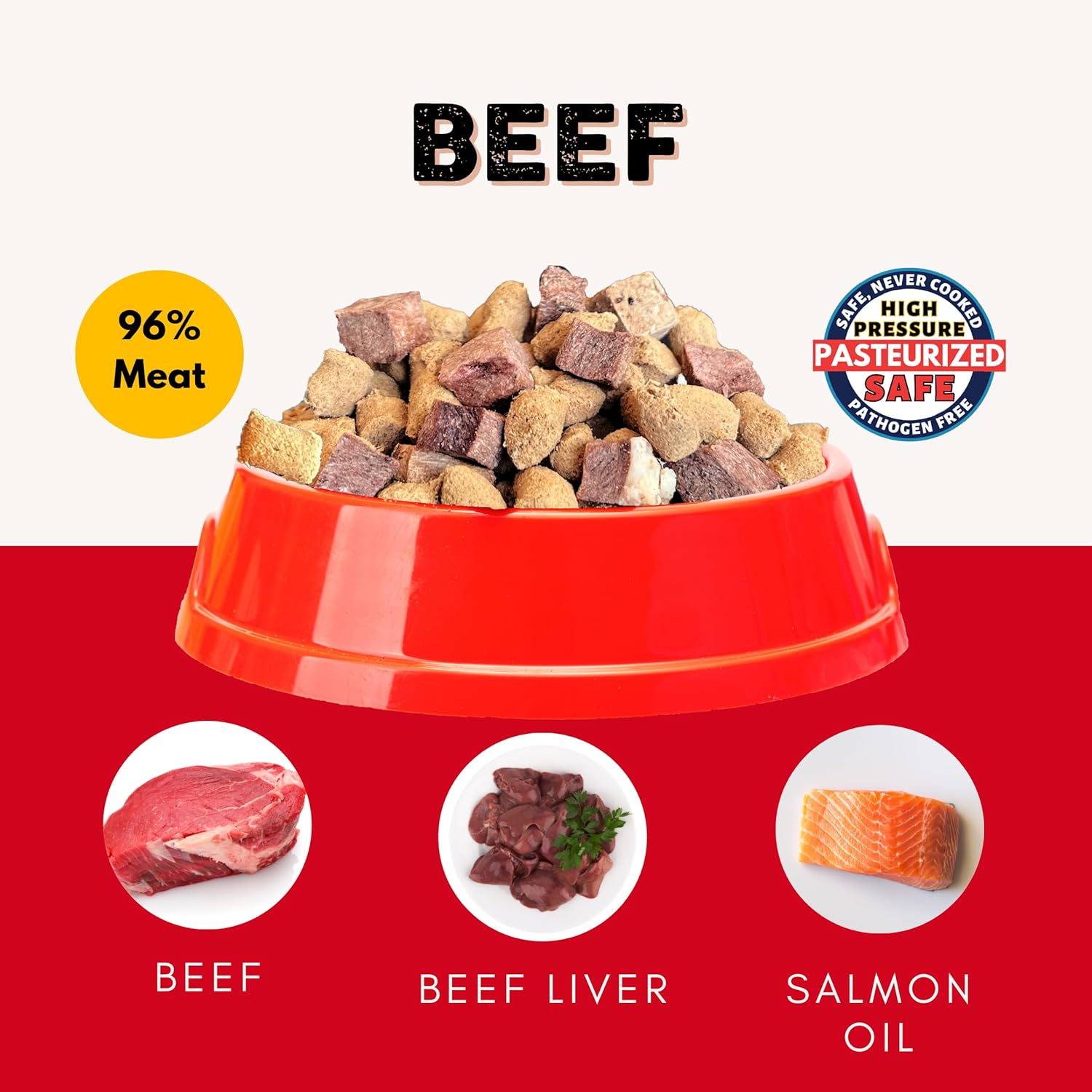 About this item 96% Beef, Organ & Bone: Nutrient-rich, biologically appropriate raw diet made with high-quality meat, organs, and bone for optimal canine health. Safe High Pressure Pasteurized (HPP): Freeze-Dried Fresh and High Pressure Pasteurized to guarantee a pathogen-free product. Safer to feed than fresh, frozen and even kibble. Serve Dry or Wet: Convenient, ready-to-serve bites that preserve essential nutrients and flavor. Serve dry for a crunchy meal or rehydrate for soft, raw food Complete & Balanced, Human Grade Ingredients: Crafted with human-grade ingredients, ensuring a complete and balanced diet that supports overall dog health for all life stages. Made in America: Proudly manufactured in the USA by our small business. › See more product details