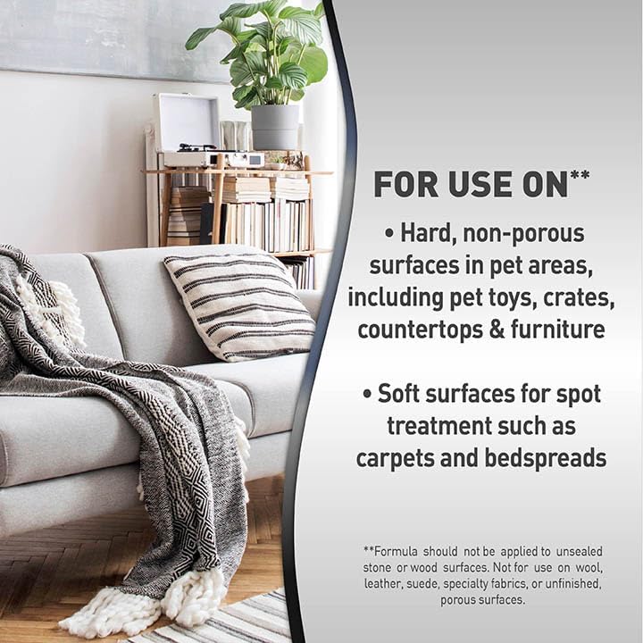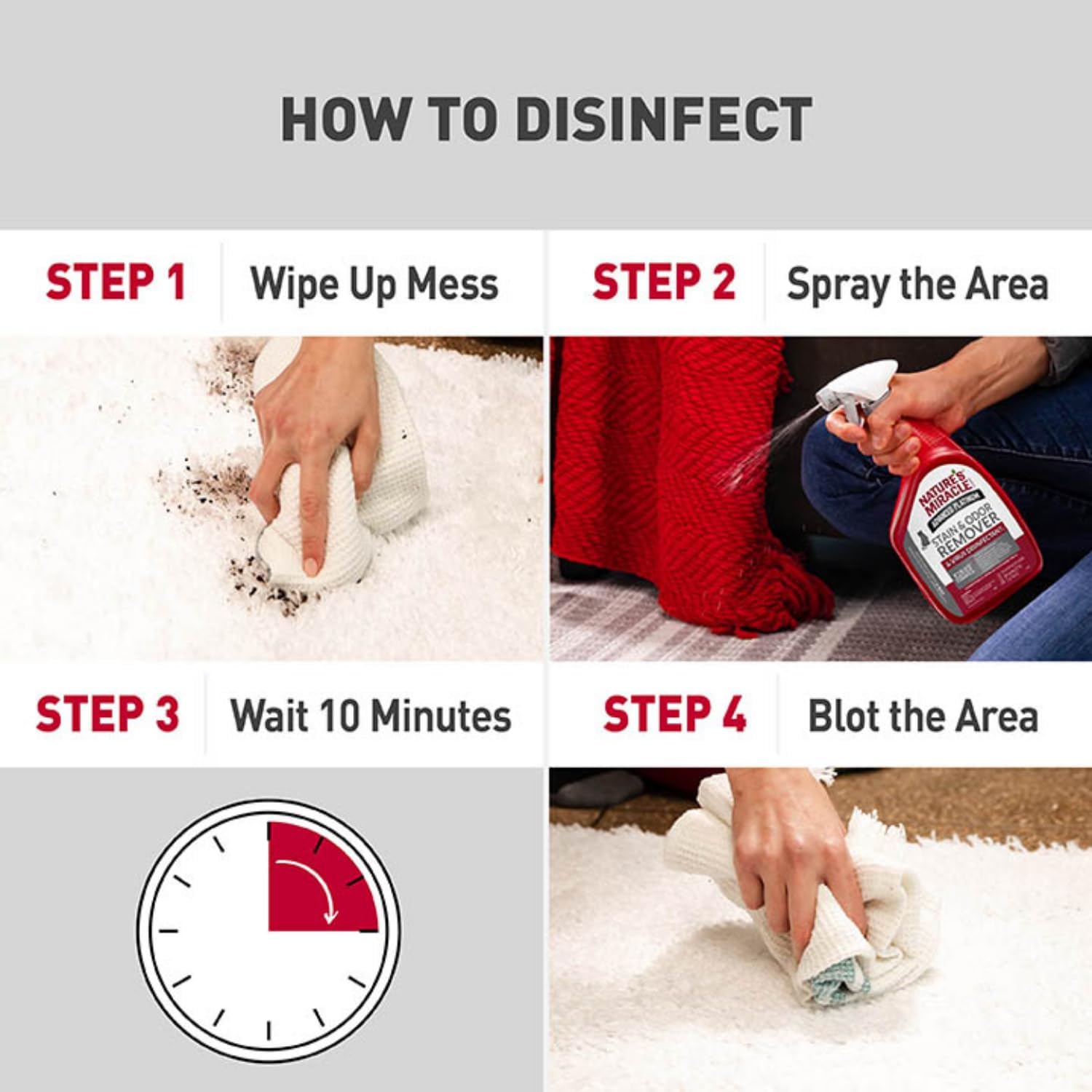 About this item The information below is per-pack only VIRUS DISINFECTANT: Powerful antibacterial formula kills 99.9 percent of cat viruses. POWERFUL FORMULA: Spot treatment eliminates tough cat messes. FRESH SCENT: Odor control formula leaves a fresh, clean scent to help your home smell clean again. TRUSTED BRAND: From the maker of Nature’s Miracle products, the pet stain and odor removing brand you trust… because it works! SAFE FOR PETS AND HOME: When used and stored as directed, this formula can be used around your pets. › See more product details