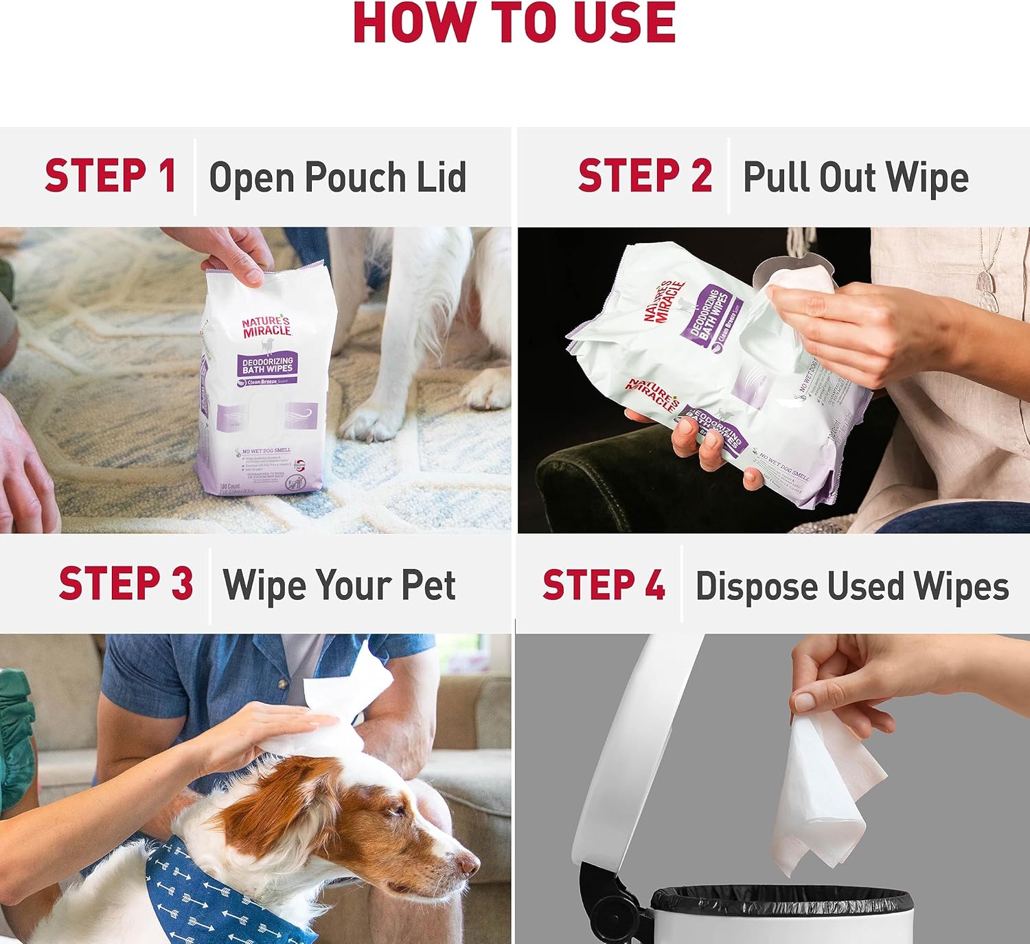 - Directions: HOW TO USE 1. Open pouch lid 2. Pull out wipe 3. Wipe your pet 4. Dispose used wipes DO NOT FLUSH SAFE FOR PETS When used and stored as directed