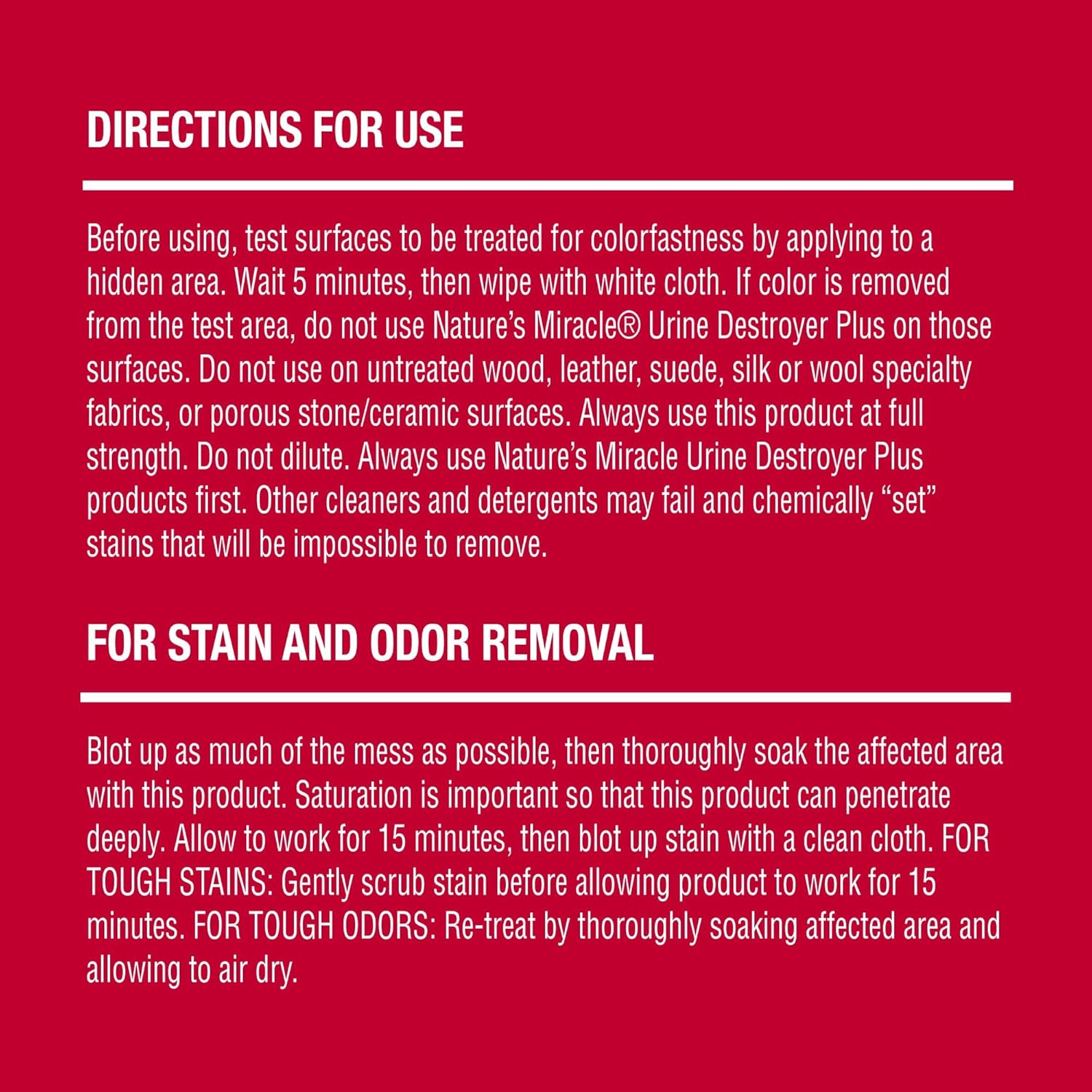 Nature’s Miracle® pet stain and odor removers have been a trusted brand for pet mess cleanup for more than 40 years. Nature’s Miracle stain and odor removers, virus disinfectants, training aids, litter and waste management, and grooming products offer solutions for life with pets, from everyday messes to the toughest cleanup jobs. Whatever pets do, you can trust Nature’s Miracle® products to undo. Accidents happen, as every pet owner knows. Nature’s Miracle® Urine Destroyer Plus for cats is an enzymatic formula that’s tough on cat urine and the yellow, sticky residue it leaves behind. The bacteria-based formula produces enzymes when it comes into contact with a food source like pet urine. This enzymatic cleaner continues working as long as the food source is present to break down and power out tough messes. Plus, the fragrance is made with essential oils for a pleasant scent. The 128-ounce bottle is easy to pour and great for refilling your smaller bottles. For use on carpets, hard floors, furniture, fabrics and more when used and stored as directed. Do not use on untreated hardwood, leather, suede, silk or wool specialty fabrics. Always use this product at full strength. Just soak the affected area, allow to work for 15 minutes, then blot up stain with a clean cloth. For tough odors, re-treat by thoroughly soaking affected area and allowing to air dry. When used and stored as directed, this product is safe to use around your pets and in your home. Always use Nature’s Miracle products first. Other cleaners and detergents may fail and chemically “set” stains that will be impossible to remove.