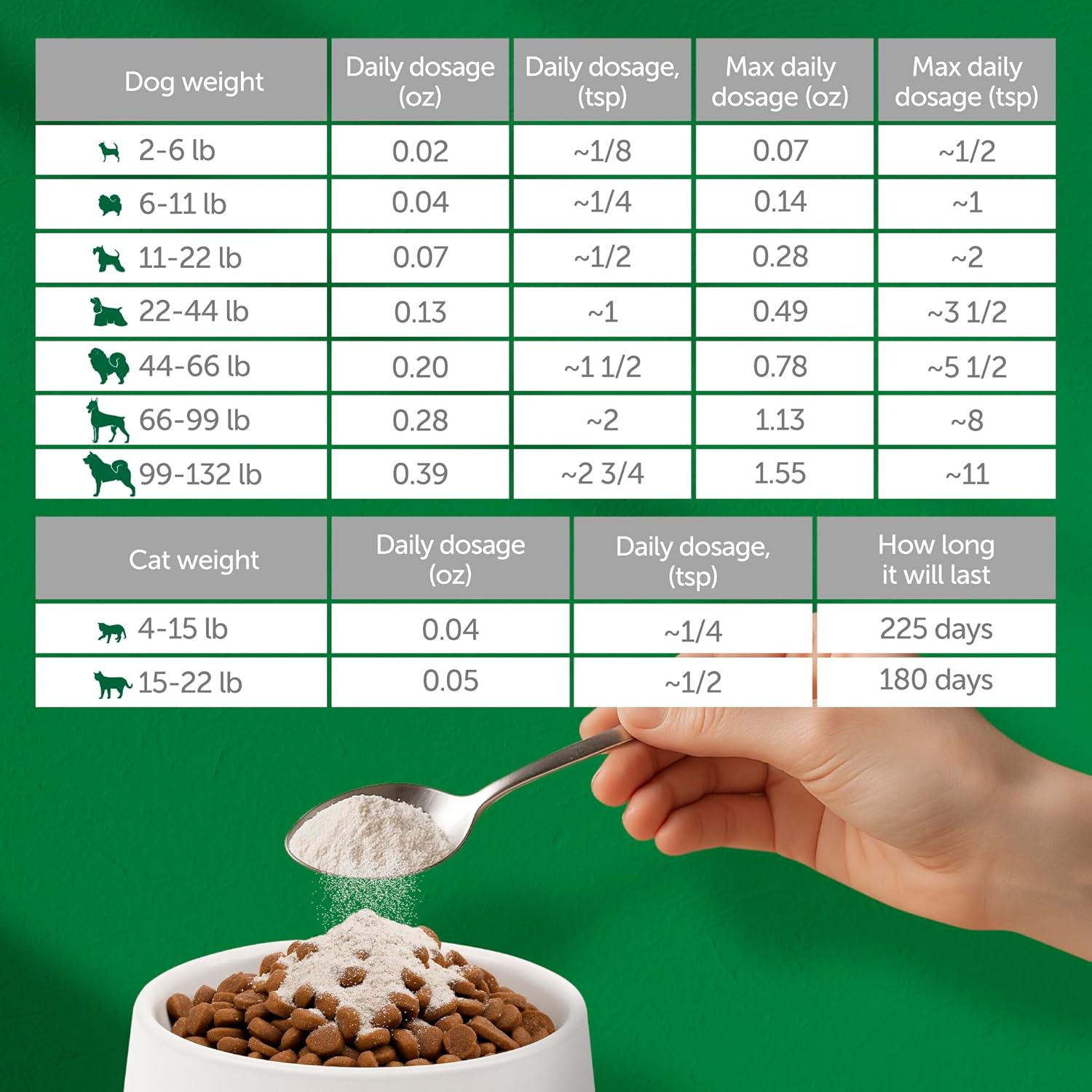 - Directions: For adult dogs up to 22 lbs, give ½ teaspoon daily (approximately 0.07 oz) with a maximum of 3 teaspoons (0.42 oz). For adult cats weighing 4.4–15.4 lbs, give ¼ teaspoon daily (approximately 0.04 oz). For larger cats 15.4–22 lbs, give ⅜ teaspoon daily (approximately 0.05 oz).