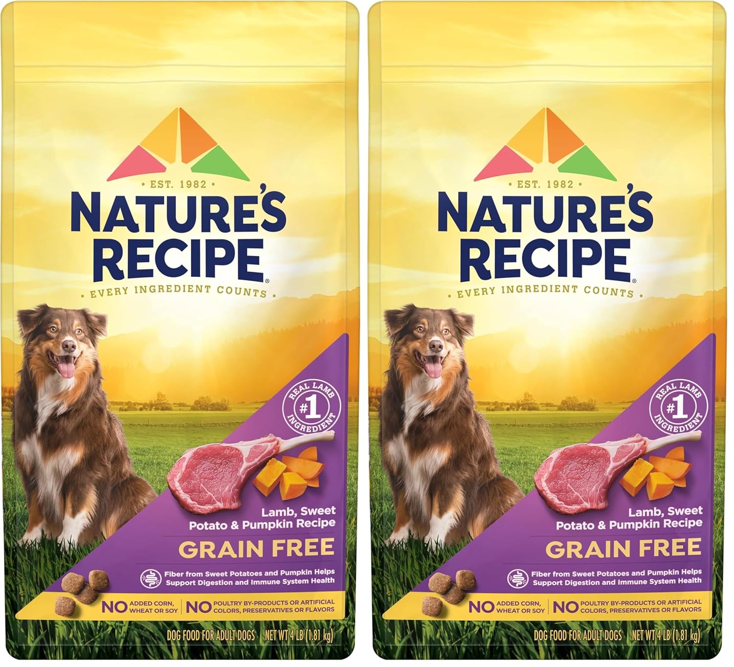 Fuel more wag-worthy adventures with wholesome ingredients dogs love — at a price you′ll love too. Nature′s Recipe dog food is formulated by expert pet nutritionists, and every single ingredient is picked with a purpose. The brand has been creating purposeful recipes for over 40 years. Nature′s Recipe Grain Free Lamb, Sweet Potato & Pumpkin Recipe is a delicious, nutritious dog kibble formulated to help support your dog′s needs. Strong Muscles: Lamb is a quality protein source that helps maintain optimal muscle strength. Healthy Digestion: Fiber from sweet potatoes and pumpkin helps support healthy digestion. Healthy Skin and Coat: Omega-3 and omega-6 fatty acids from chicken fat and lamb help support skin and coat health. Strong Immune System: Antioxidants zinc and vitamin E help support a healthy immune system. Healthy Heart: Taurine helps support a healthy heart. Try this tasty, grain free dry dog food now to give your dog healthy fuel for a happy life.