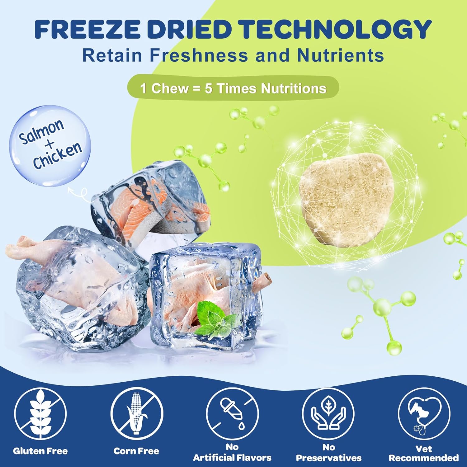 About this item Higher Level Formulations - Nature Target selects Wild Alaskan Salmon Oil for dogs as the sole source of natural omega-3 6 9 fatty acids. Contains 520 mg EPA + DHA per two chews, surpassing other brands. 120 Bites in the vacuum seal bag and shelf-stable jar. With special freeze-dried technology minimizes spoilage and maximizes ingredient activity and stability. Our salmon oil for cats & dogs are nutritious and delectable, ensuring your dog eagerly awaits their daily dose of essential nutrients. Advanced Dog Skin and Coat Supplement - Nature Target fish oil for dogs skin and coat contains Fish Oil, Biotin, Zinc, Vitamin C and E. These vitamins, minerals, omegas, and antioxidants may help with dry, sensitive skin. These ingredients work together to enhance coat texture, promote a shiny and glossy appearance, and minimize shedding. Provides comprehensive support for your furry friend's skin and coat needs. Boost Immunity for Allergy Relif & Hip Health - A strong immune system is vital to overall health. Nature Target dog allergy chews with powerful Omega-3 fatty acids and vitamins to strengthen immunity, that help resist allergens. The anti-inflammatory properties of Omega-3s can help relieve itching, scratching, paw licking and hot spots. In addition, it promotes hip and joint health. Avoiding exhibits signs of joint pain or stiffness in your dog. Provide your dog with energy and comfort. Premium Omega for All Dogs & Cats - Omega 3 for dogs is a vital element to keep your dogs active, support healthy hip and joints, brain, heart, immune health. Nature Target dog supplements & vitamins is perfect for all ages and sizes from puppy to senior dogs. It can help maintain healthy skin and coat, promote heart and cognitive functions, as well as alleviate inflammation and provide other benefits. Support your dog's overall well-being. All-Natural Ingredients: We prioritize your dog's well-being. Our dog fish oil freeze-dried chews are based on real chicken & salmon and are perfect for picky eaters. We remove the moisture of all high-quality ingredients to retain nutrients and flavor. It is free of any artificial additives or fillers. No wheat, corn, soy, or gluten. Non-GMO and is vet recommended. Your dog will not only look great but also feel their best from the inside out. Piece Size May Vary: We use 100% real, whole ingredients and a natural freeze-drying process, the size and shape of the pieces can vary slightly from batch to batch. This is actually a sign that we preserve the natural nutrition and integrity of the food › See more product details