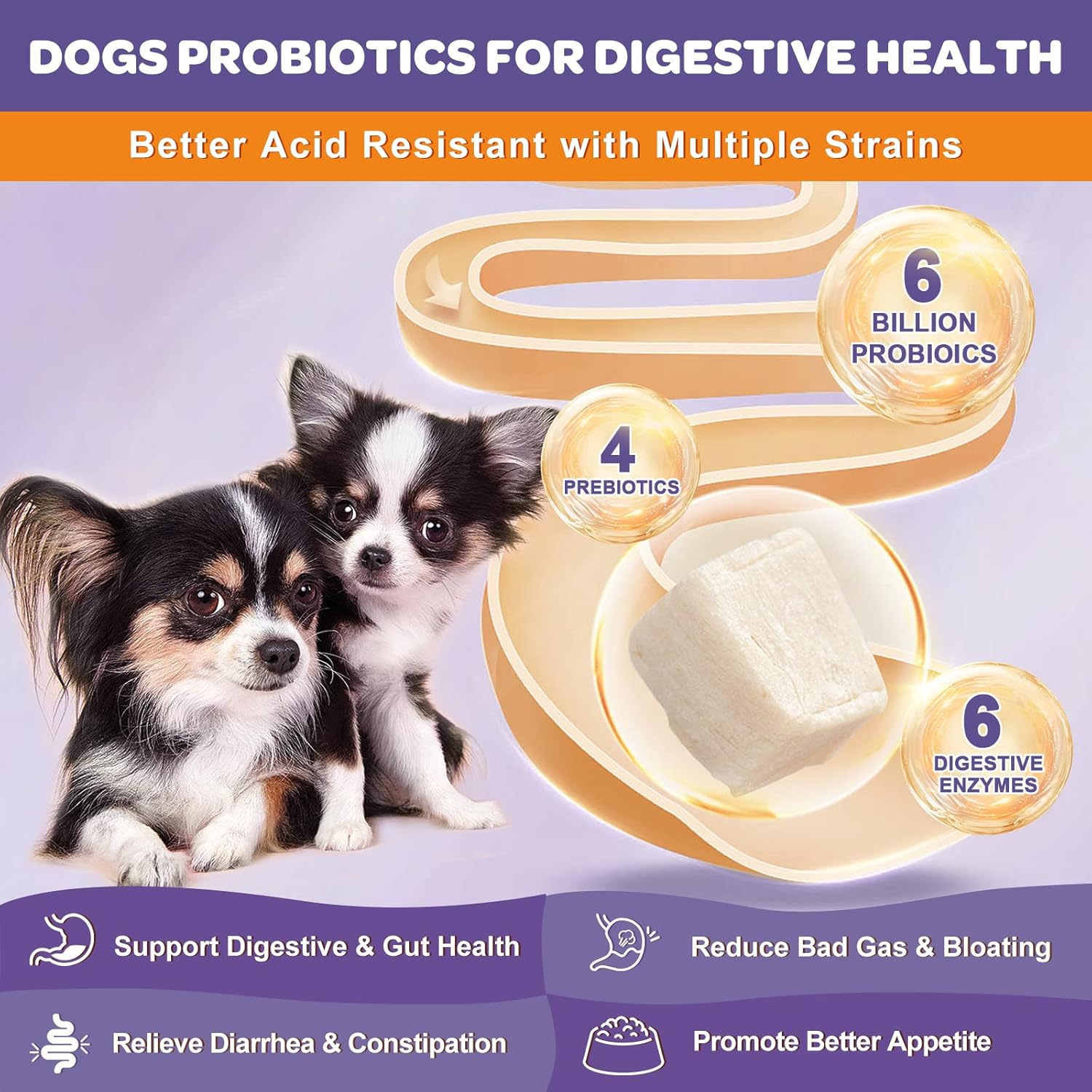 The Only 6B Freeze Dried Dog Probiotics: 6 billion CFUs probiotics for dogs, much more than other brands. With special freeze-dried technology, it maximizes the activity and the stability of probiotics. Once consumed by your pets, these live probiotics will be reactivated and provide powerful benefits. Vacuum packaging and shelf-stable jar all provide strong protection for active ingredients until expiry. It contains 120 chews and is designed for all sizes and all breeds of dogs and cats. Revolutionize Your Pet's Digestive Health: Our probiotic soft chews introduce a 5-in-1 powerhouse for comprehensive dog well-being. Enriched with probiotics,prebiotics, digestive enzymes, vitamins, and fish oil, these 120 chews offer a holistic solution to support gut and overall health. Each chew packs 6 billion CFUs and 12 probiotic strains, including Bacillus subtilis and Bacillus coagulans, effectively relieving constipation, diarrhea, and vomiting. Elevate your furry friend's immune support βΊ See more product details