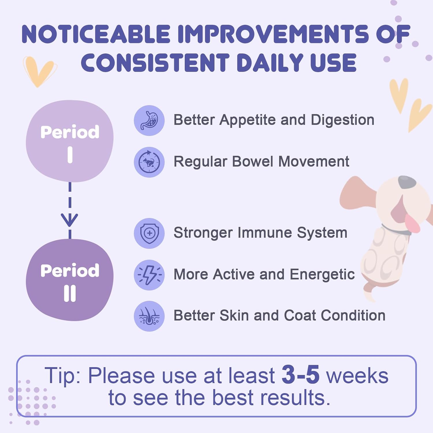 About this item VET CRAFTED FORMULA: Combined probiotics, digestive enzymes, fiber and prebiotic, our probiotic for dogs aid digestion and gut flora. With more live cultures, 6 billion CFU, the optimal dog gut health probiotics blend make a highly effective probiotic 4 IN 1 DAILY GUT SUPPORT: The pet probiotics for dogs promote optimal gut health and balance. This dog probiotics for digestive health help soothe upset stomach, relieve dog diarrhea, bloating and loose stool and also help boost the nutrient absorption BOOST IMMUNE AND ANTIOXIDANT: Gut health is key of strong immune system. Our puppy probiotic also add Plasma Protein, Astragalus, Astaxanthin provide extra immunity & antioxidant support, help reduce intestinal inflammation and support an active dog DOG ALLERGY AND ITCH RELIEF: With carefully selected strains, the probiotics for dogs for allergies and itchy skin may help soothe symptoms related to food allergies, supporting a strong skin barrier and promote healthy skin and coat condition EASY TO USE DOG FOOD TOPPER: Our probiotic powder for dogs boost your pet's mealtime with the perfect blend of tasty flavor and health benefits. Just simply complement dry or wet dog food, your pup will get complete nutritional support without even notice TASTY SCOOP FOR ALL AGES AND BREEDS: Our probióticos para perros use real chicken liver that ensures your dog will definitely love it.Each jar holds an incredible 30 servings for a 60 lb. dog, supporting long-lasting benefits at an unbeatable price PREMIUM INGREDIENTS YOU CAN TRUST: We refuse to add useless fillers, artificial flavor. Our product is all natural, gluten, soy, corn free, non-GMO, and GMP compliant. You are giving a safe dog diarrhea medication that has been tested for quality & purity › See more product details