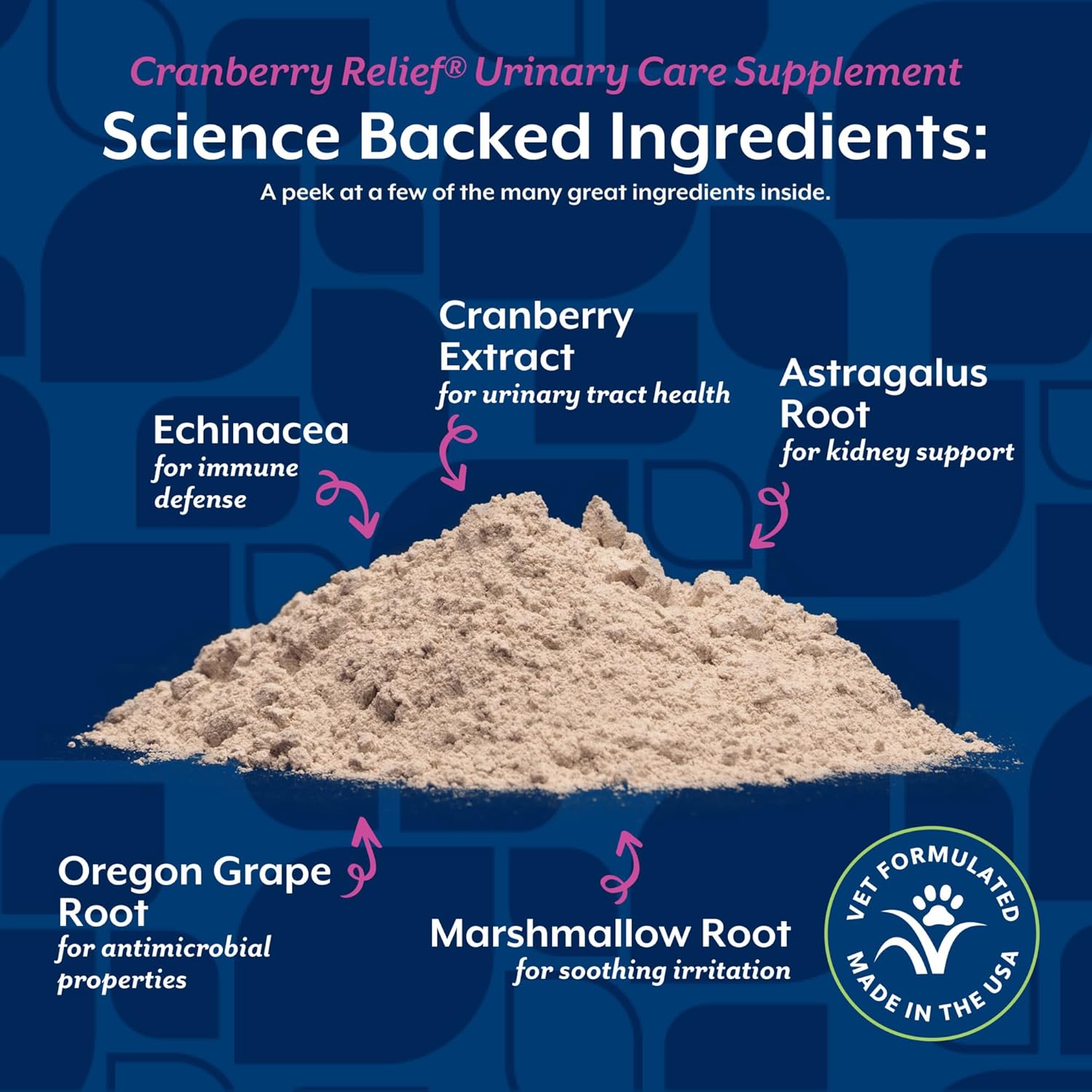 - Directions: NaturVet Cranberry Relief (50 gm.) For use in dogs and cats over the age of six weeks. Recommended to help maintain and support a healthy urinary tract. Guaranteed Analysis Analysis per 1 cc scoop Cran-Max (Cranberry Extract) - 210 mg Echinacea Purpurea - 105 mg Oregon Grape Root - 34 mg Ester-C (calcium ascorbate) - 34 mg