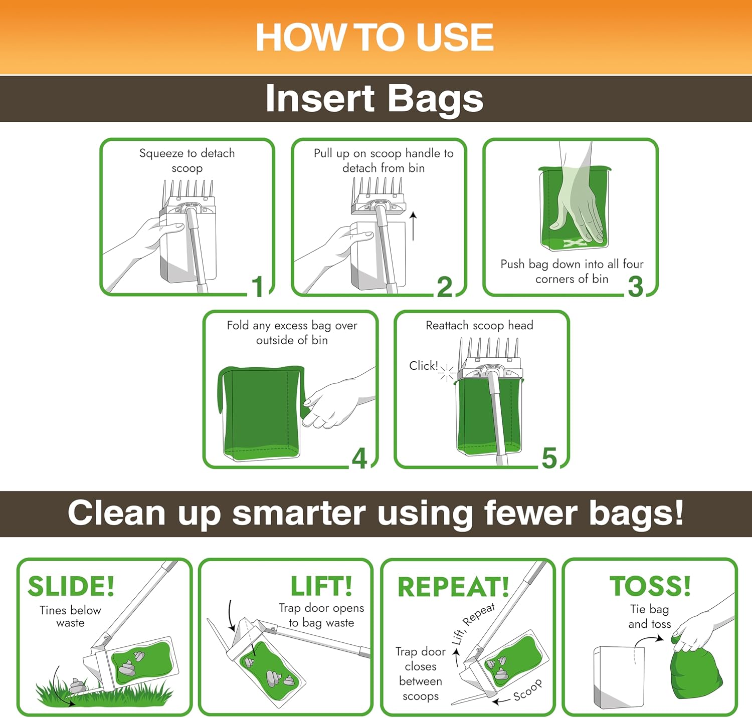 - Directions: 1. Line bin with a bag, pushing the bag down into the corners of the bin. 2. Reattach scoop head. 3. Pick up waste in yard by sliding tines under the waste and lifting. 4. When finished picking up waste, remove scoop head and bag. 5. Tie bag shut using handles and toss in the trash.