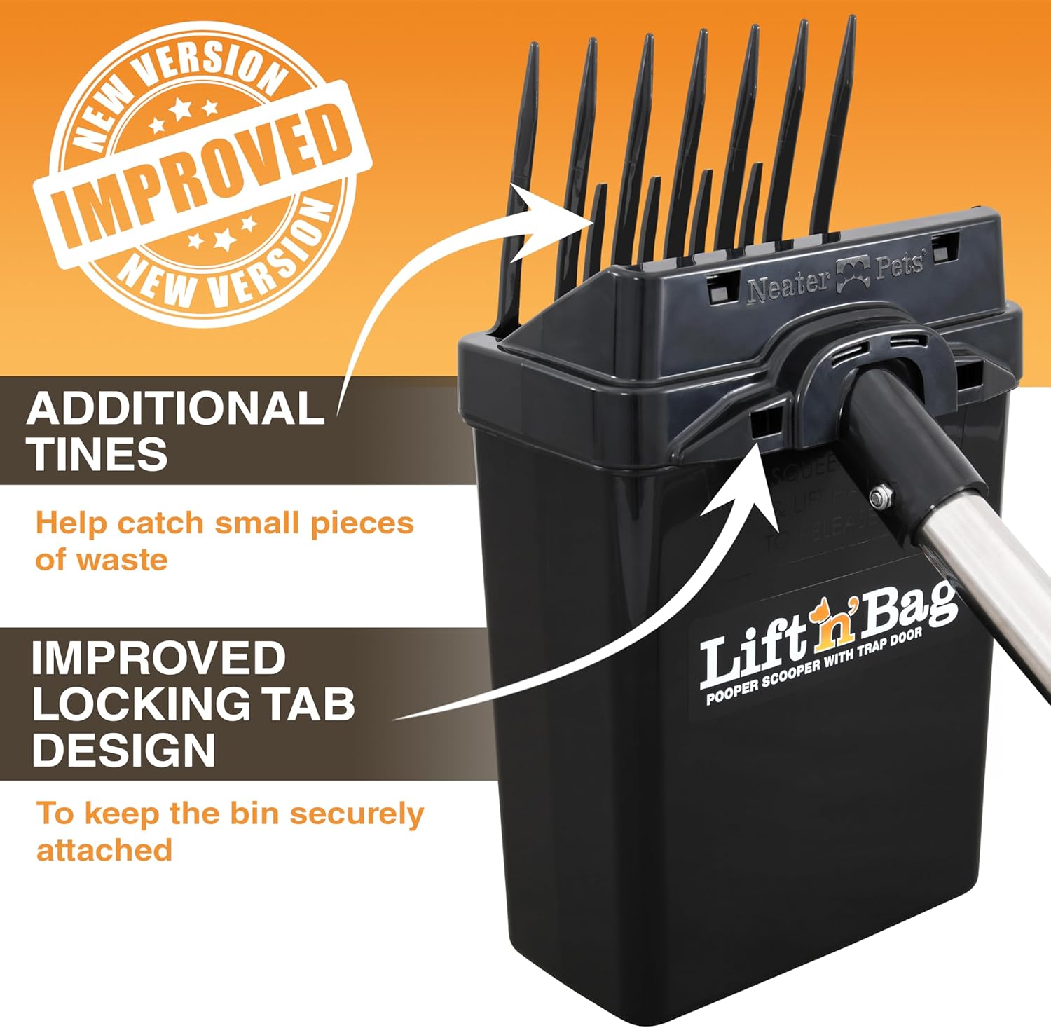 NEW & IMPROVED DESIGN: We listened to your feedback and re-engineered the Lift N’ Bag Dog Pooper Scooper to create a stronger connection between the scoop and bin and added extra tines to pick up smaller waste pieces, for a quick, frustration-free yard cleanup. Proudly Made in the USA. Patented & Patents Pending. LIFTS WASTE CLEANLY – LEAVES NOTHING BEHIND: Unlike claw and rake pooper scoopers that smush, smear, or leave residue behind, Lift N’ Bag’s scoop slides under waste and lifts it cleanly in one easy motion. The result? A truly spotless yard where kids can play without worry, and you can host backyard BBQs without the fear of hidden surprises. EFFORTLESS ONE-HANDED CLEANUP: Revolutionize your pet waste routine! The Lift N’ Bag poop scooper for dogs lets you quickly LIFT and BAG waste from grass, dirt, gravel, and pavement—all with one hand. No more juggling rakes, trash cans, or messy bags. Used as a cleaner alternative to traditional scooping tools, it ensures zero hand contact—keeping you clean and stress-free. Use it to clean anything from a backyard to a park. SAVE MONEY ON BAGS & REDUCE PLASTIC WASTE: Lift N’ Bag’s unique trap door closes between scoops, reducing odors and sealing waste inside. Easily pick up 5–10 piles of waste per bag (depending on size), making each roll of bags last significantly longer. This saves money and reduces plastic waste, giving you more value with fewer bags. Perfect for environmentally conscious pet parents who also value hygiene and convenience. DURABLE YET LIGHTWEIGHT: This pooper scooper for small dog to large dogs is built from heavy-duty plastic that won’t rust or corrode, yet is light enough for senior pet owners, dog walkers, and even children to use. The one-handed design frees up your other hand for a leash, coffee, or phone. Bin size: 7.5" H x 6.25" W x 3.5" D. Pole is 27" long. INCLUDES SCENTED BAGS AND DISPENSER: Comes with 15 lavender-scented bags for odor control, plus a convenient leash-attachable dispenser. These bags are larger than standard pet waste bags and custom-fit for the Lift N’ Bag. For best results, use Lift N’ Bag refills; however, other large pet waste bags may also work. › See more product details