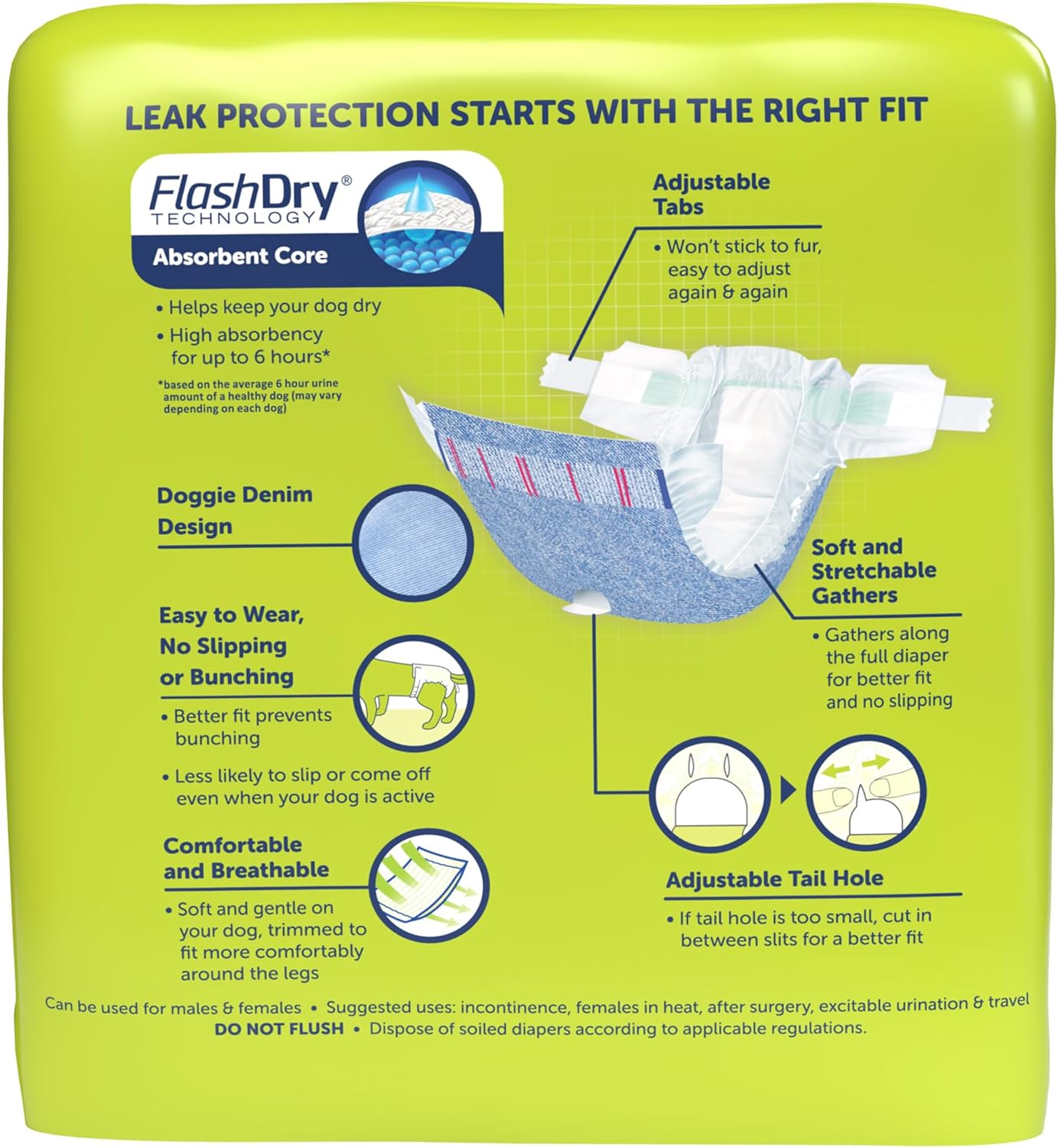 - Specific Uses for Product: Female Heat, Surgery Recovery, Incontinence, Puppy Training, Travel, Urinary, Urinary Tract Control