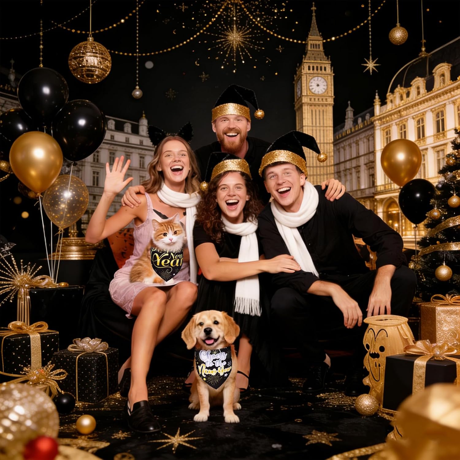 • New Years-themed design The main colors of the pet bandanas is black , allowing your pet to showcase a unique and distinctive style.