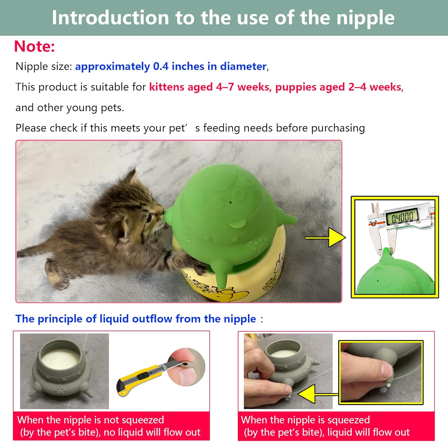 About this item Suitable for Young Pets: Suitable for kittens aged 4–7 weeks, puppies aged 2–4 weeks, helping pet owners provide accurate feeding Multi-Nipple Design: Features a multi-nipple structure that allows several young pets to feed at the same time, making feeding more efficient Precise Milk Flow: Each nipple is about 0.4 inches in diameter and stays closed under normal conditions. Milk is released only when pets suckle, offering controlled flow Practical Feeding Tip: If the container is too low and affects feeding posture, place it on a raised surface for a more comfortable feeding experience › See more product details