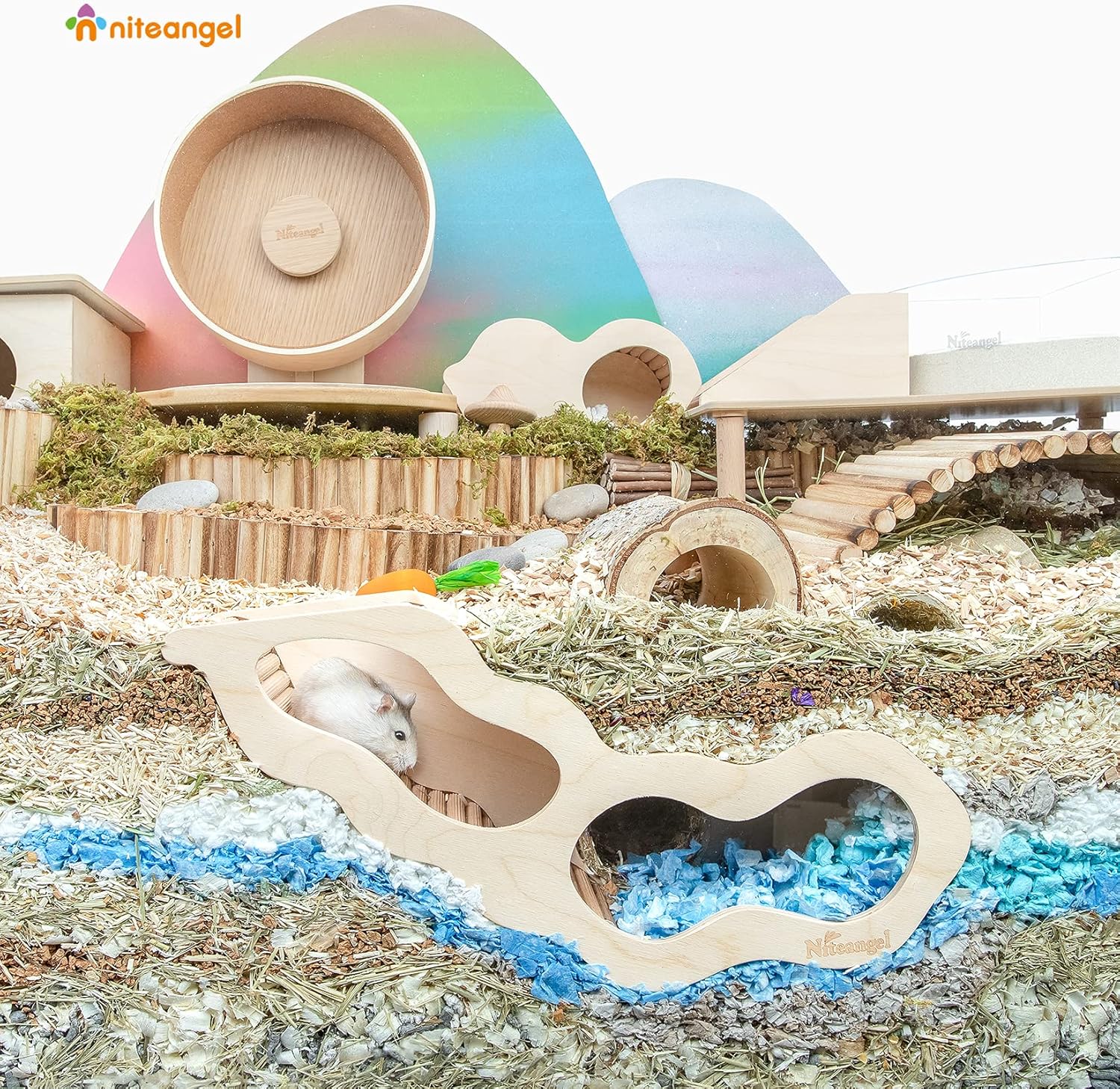 About this item Hamster Hideout Hut & Climbing Ramp Tow-in-one - The design of the exercise ladder roof makes the house no more monotonous. This not only provides a hideaway for little pets can hide, rest, store, and eat in a quiet & secure place, but also makes pets improve their balance abilities and relieve emotions by practice & play, and help your hammy to access to other platforms easily Creative Hamster Habitats Decor - Adorable & good-looking cartoon-shaped wooden hamster shelter cabin brings more interesting viewing on hamster cage decors, easy to match many of cage themes Hand-made and Pet-friendly material - Hand-made by selected birch plywood & beech sticks without nails, the whole structure is sturdy and there have no gaps on climb ladders of the roof. Each corner of this hamster house are sanded smooth, brings you a durable & chewable hamster house & toy, helps to relieve their chewing desire & protect the pet’s teeth A Design That Knows The Pets - Semi-closed pet hut with a cave is comfortable, breathable, and gives a sense of security, and the diameter of the entrance is around 2.1-inch, it's recommended for dwarf hamsters, tiny gerbils, mice, or other similar-sized pets Easy To Clean And Pets Tease - Bottomless design can better to clean the interior, interact with your pet, and change bedding › See more product details
