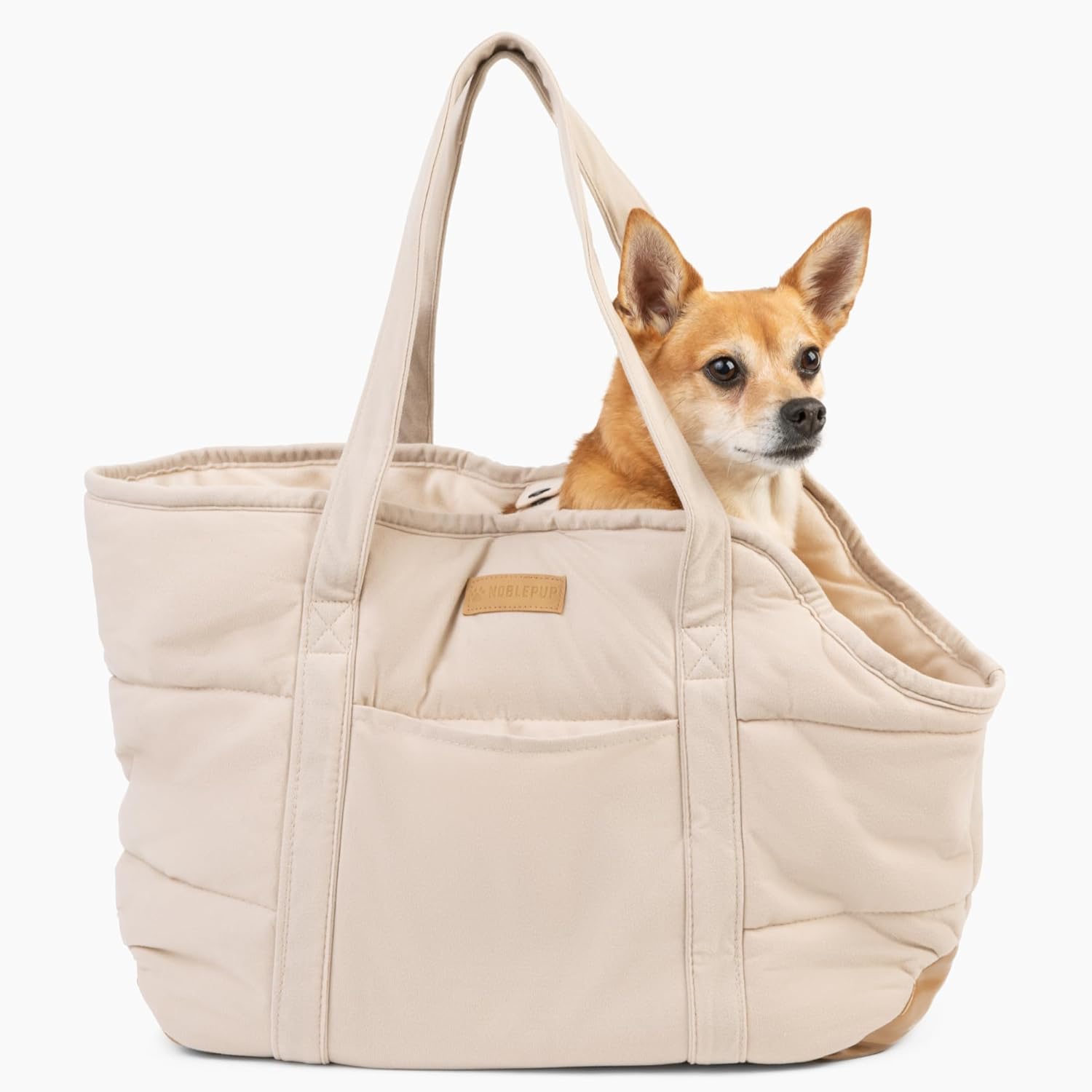 Step out in style and comfort with the NoblePup Plush Pup Pouch, the ultimate dog carrier for pet parents on the go! Designed specifically for the urban dog owner, this chic yet practical dog purse is tailored for small to medium-sized dogs, supporting up to 15 lbs (6.8 kg). Whether you're headed to a cafe or catching the subway, your furry friend will enjoy every journey in the lap of luxury. Comfort Meets Style: This isn't just another pet carrier. It's an elegant fashion accessory that doubles as a cozy haven for your pet, designed with a plush, ultra-soft interior that your dog will love. Premium Functionality: Includes a secure internal collar-to-leash attachment for added safety, and a machine washable design for hassle-free maintenance. Spacious Exterior Pocket: Keep all your essentials like keys, wallet, and dog treats within easy reach thanks to the conveniently placed large outer pocket. Travel Ready: While not airline compliant, this dog carrier is perfect for everyday travel around town. Durable and Safe: Crafted with minimalist design elements, this dog purse is built to last but lightweight enough to carry anywhere. Features a removable wooden base and foam cushion to ensure stability and comfort for your pet. Care Instructions: Simply remove the internal wooden board and foam cushion before washing. Wash on a gentle cycle with cold water and tumble dry on low to maintain the plush texture and quality. Avoid ironing or bleaching to keep your carrier looking its best. Grab the NoblePup Plush Pup Pouch today and make your pet's travel experiences as comfortable and stylish as your own! Ideal for pet lovers seeking a blend of luxury, safety, and convenience. Perfect for dog walks, vet visits, and urban adventures. Secure your pet's comfort on the go with this essential dog travel accessory!