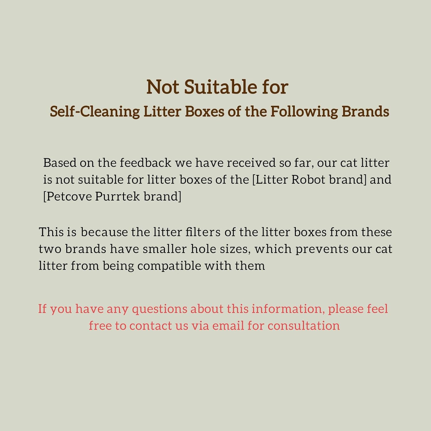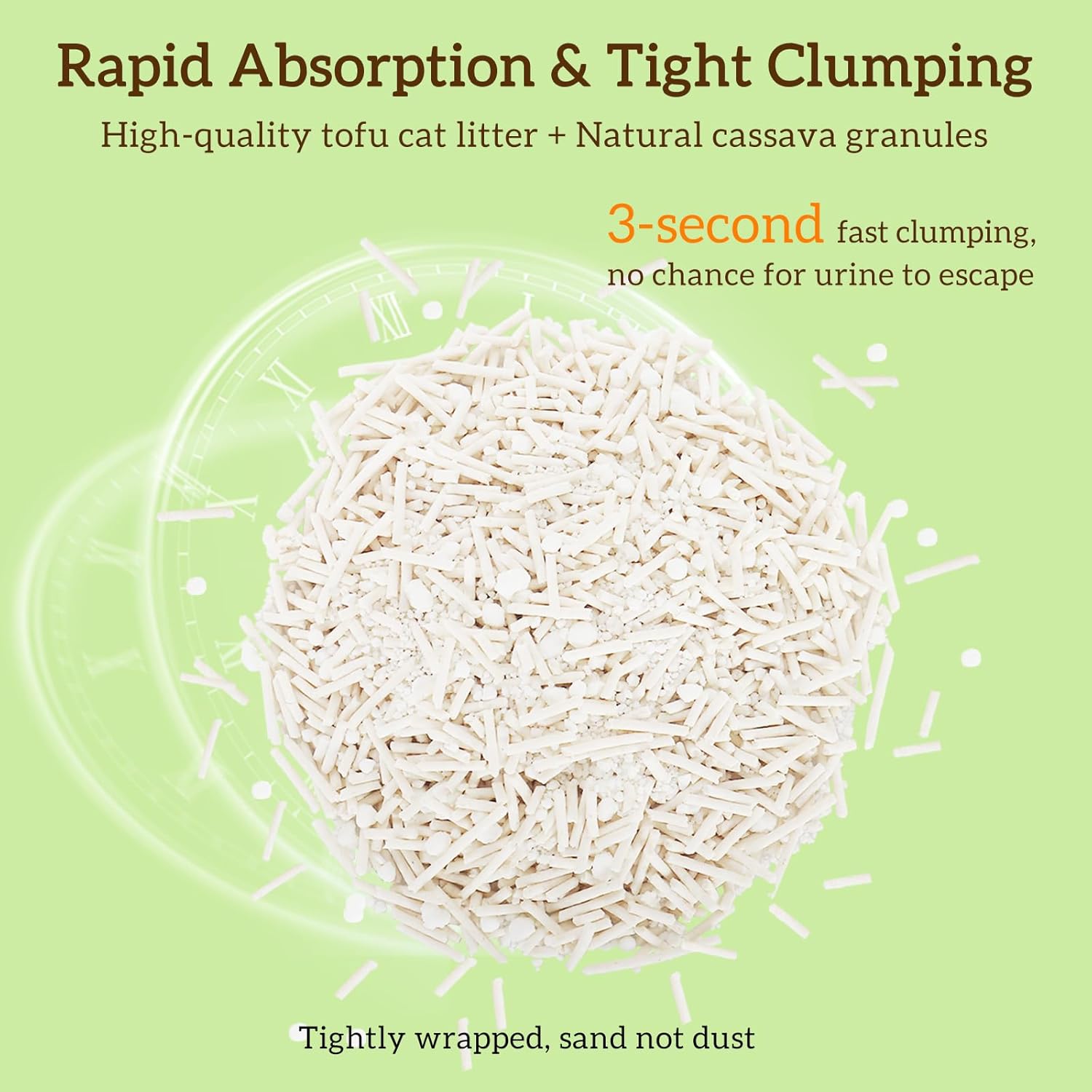 About this item TOFU CAT LITTER MIX WITH CASSAVA: Our cat litter is made from peas, corn, cassava, and baking soda. It is all-natural, biodegradable, and friendly and safe for cats. By combining the respective advantages of tofu cat litter and cassava cat litter, it achieves a result that is greater than the sum of its parts. Tips: Based on the feedback we have received so far, our cat litter is not suitable for litter boxes of the and This is because the litter filters of the litter boxes from these two brands have smaller hole sizes, which prevents our cat litter from being compatible with them If you have any questions about this information, please feel free to contact us via email for consultation NON-STICK & EASY TO SCOOP: The particles of our mixed plant-based cat litter fill each other, forming a denser and more uniform structure. It prevents urine from reaching the bottom of the litter box, isolating and buffering effectively. Combined with cassava particles' ultra - fast water - absorbing ability, it reduces the accumulation of urine at the bottom, further lowers the risk of bottom sticking. From now on, just one scoop, keeping both the litter box and the scoop clean. No more struggling to clean the litter box and scoop FAST ABSORPTION & STRONG CLUMPING: The particles of our mixed cat litter interweave and interact with each other, forming a complex pore network. This structure increases the contact area between the cat litter and urine, enabling quicker dispersion, absorption, and firmer clumping. During cleaning , you can scoop up the clumps as a whole without them falling apart, reducing the difficulty of cleaning After pouring the cat litter, shake the litter box to let the cassava particles sink to the bottom for optimal performance HIGH-EFFICIENCY ODOR CONTROL MORE COST-EFFECTIVE THAN CLAY CAT LITTER: When comparing the same weight, our cat litter has twice the volume of clay litter. Through calculation and experiments, it also lasts twice as long as clay litter. In terms of price, the unit price of clay litter on the market is $1-1.5 per pound, while the unit price of our cat litter is about $2 per pound. However, when calculated based on volume (i.e., the actual usage amount), our cat litter has a lower cost for the same usage duration and is more cost-effective than clay litter LOW TRACKING: Compared with fine-grained bentonite cat litter, our mixed cat litter is low tracking. It can reduce the mess at home VISIBLE HEALTH INDICATOR: The light-colored cat litter allows you to clearly see the color of your cat's urine. Unlike other dark-colored cat litters, it enables you to intuitively observe your cat's health condition High-Temperature Curing Treatment - friendly and safe for cats Show more › See more product details