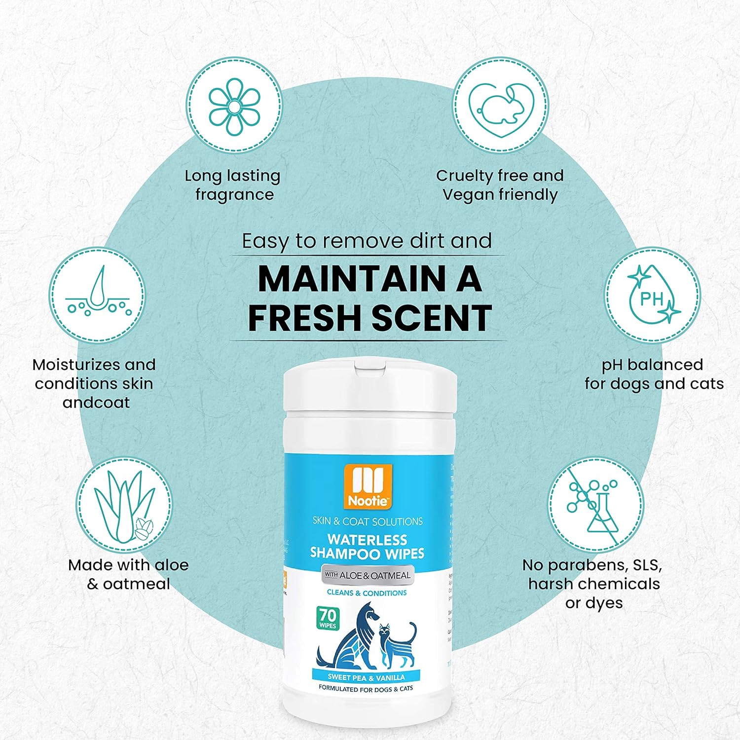 Keep your pet clean and smelling fresh between baths with Nootie Waterless Shampoo Wipes. These no-rinse, alcohol-free, deodorizing pet wipes have a sweet floral Sweet Pea and Vanilla fragrance that will keep your dog or cat smelling great! Our formula contains active cleansing ingredients plus fur-softening glycerin and soothing aloe and oatmeal to clean and condition your pet's skin and coat. Nootie Pet Shampoo is pH balanced for dogs and cats, and is free from any parabens, SLS, harsh chemicals, or dyes that can cause skin irritation. Nootie products are made in the USA and sold in over 10,000 vet clinics and pet stores worldwide.