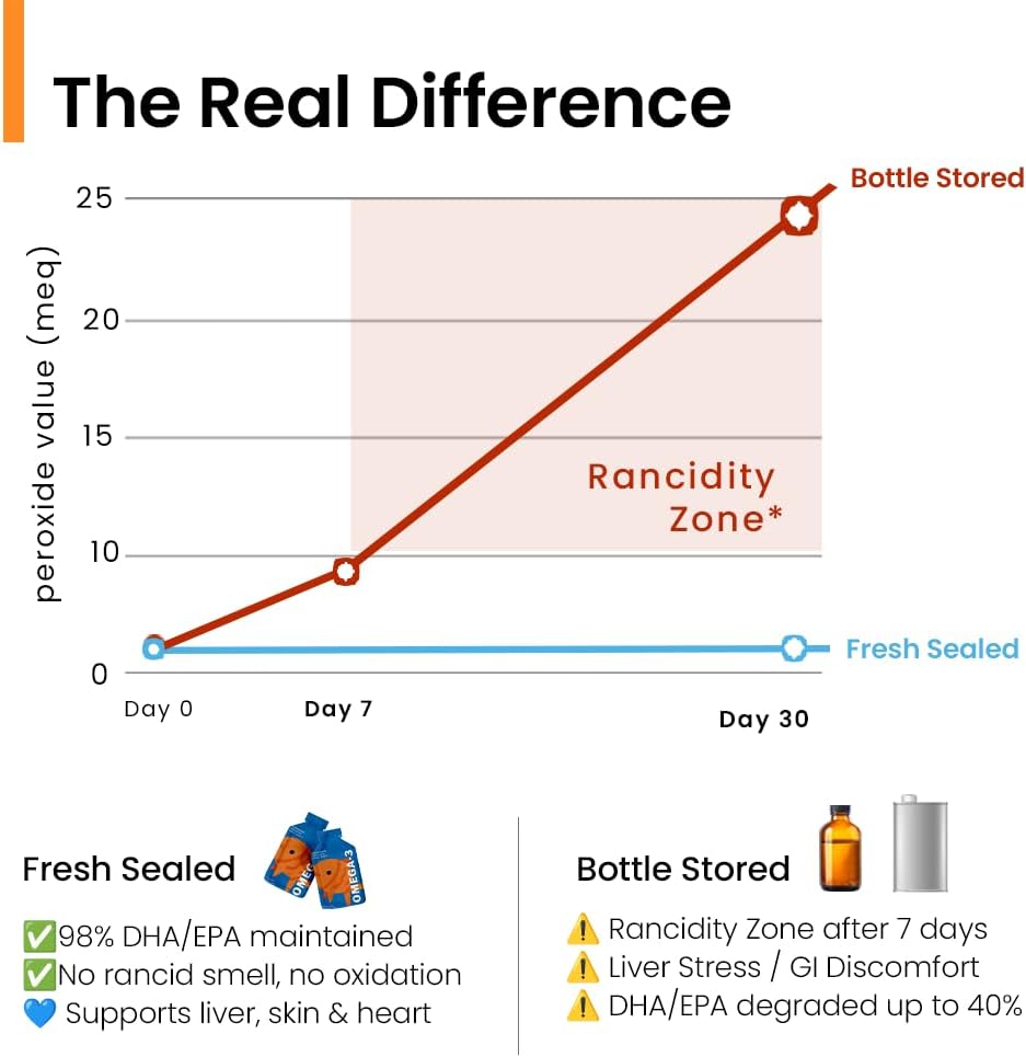 About this item HUMAN GRADE & VET APPROVED – Crafted to the same standards as human supplements in FDA-registered, GMP-certified USA facilities. Trusted by veterinarians for quality and safety. IFOS 5-STAR NORWEGIAN FISH OIL – Premium Epax oil sourced from sustainable fisheries, delivering purity and potency verified by IFOS testing. OXIDATION-PROTECTED SACHETS – Individually sealed, single-serve packaging prevents oxidation, locks in potency, and avoids the rancidity of pump bottles. Every serving is fresh. PATENTED & CLINICALLY BACKED – Supported by patented innovation and over 100 clinical trials, ensuring scientifically proven results for your dog’s health. MAXIMUM ABSORPTION FORMULA – Each sachet provides 1,150 mg Omega-3 (525 mg DHA + 325 mg EPA) in the superior rTG form, proven to deliver higher bioavailability for skin, coat, joints, heart, and brain health. › See more product details