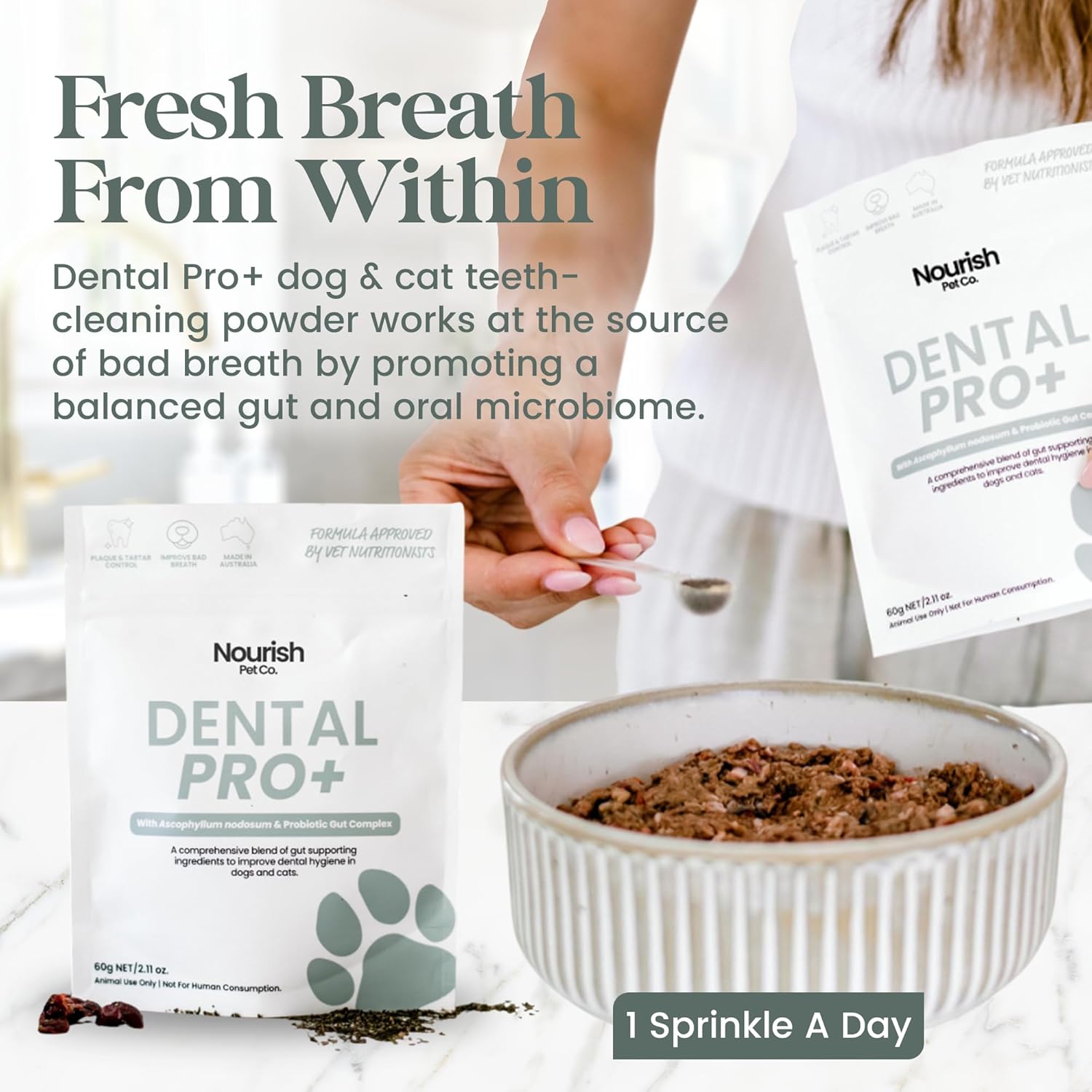 FRESHER BREATH STARTS INSIDE - Dental Pro+ cat & dog teeth cleaning powder tackles the root of pet bad breath by supporting a healthy gut and mouth microbiome. A sprinkle a day keeps the bad breath away. DAILY ORAL DEFENSE - This easy-to-use dental powder is a breath freshener that helps prevent plaque buildup and tartar before they start - helping to reduce the risk of gum problems and expensive vet visits. ZERO BRUSHING, ZERO FUSS - No more toothbrush battles. Just mix into wet or dry food for simple, stress-free dental care. JUST THE GOOD STUFF - No fillers or artificial preservatives - only 100% natural ingredients to support your pet’s best health. VET-ENDORSED DENTAL CARE - Trusted by leading veterinary nutritionists, Dental Pro+ pet tooth powder helps break down tough plaque biofilm to support cleaner teeth and healthier gums. › See more product details