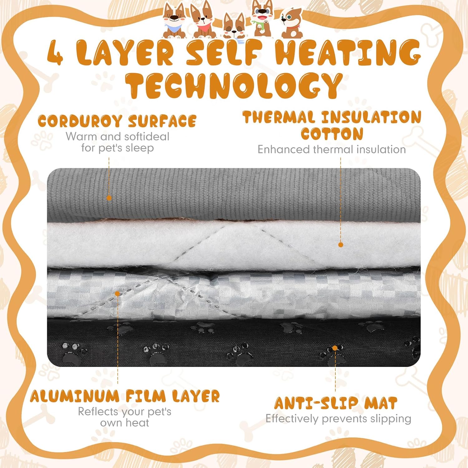 Features: Easy to clean: the heated pet mattress can be machine washed on a gentle cycle for easy warmth and cleanliness Soft Surface: made with corduroy fabric, the self-heating mat provides a warm, comfortable, and cozy sleep surface for your cat, helping your pet calm down faster, relieve anxiety, and fall asleep peacefully. Specifications: Material: corduroy fabric Color: gray Size: 23.6 x 17.7 inches/45 x 60 cm Package includes: 4 x Pet Heating Pad Notes: Manual measurement, please allow slight errors on size. The color may exist a slight difference due to different screen displays. Small items are included, please keep them away from pets in case of choking risk. Before purchase, confirm whether the product size is suitable for your pet, and observe the pet's reaction when using. Please remove the product in time if there is any discomfort