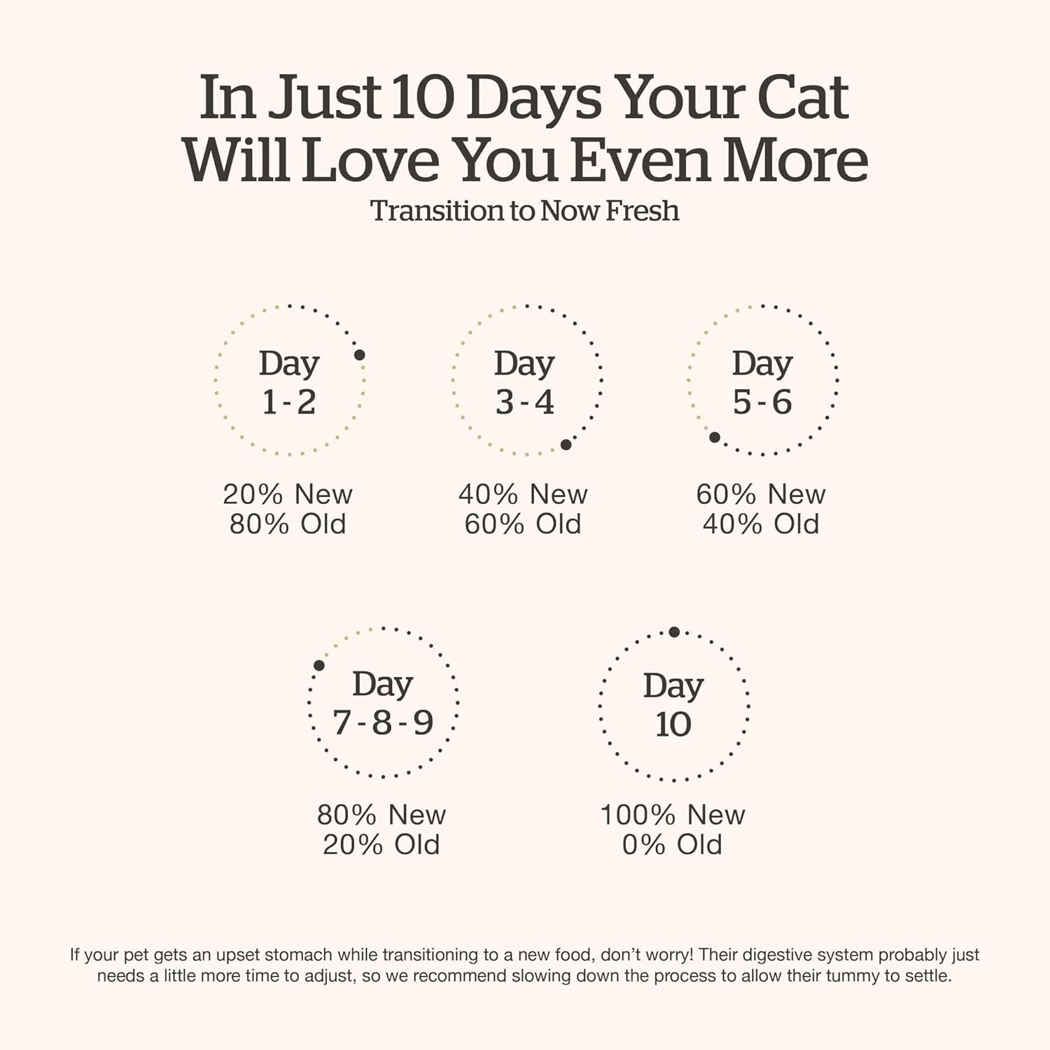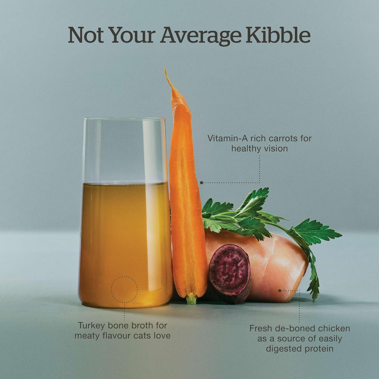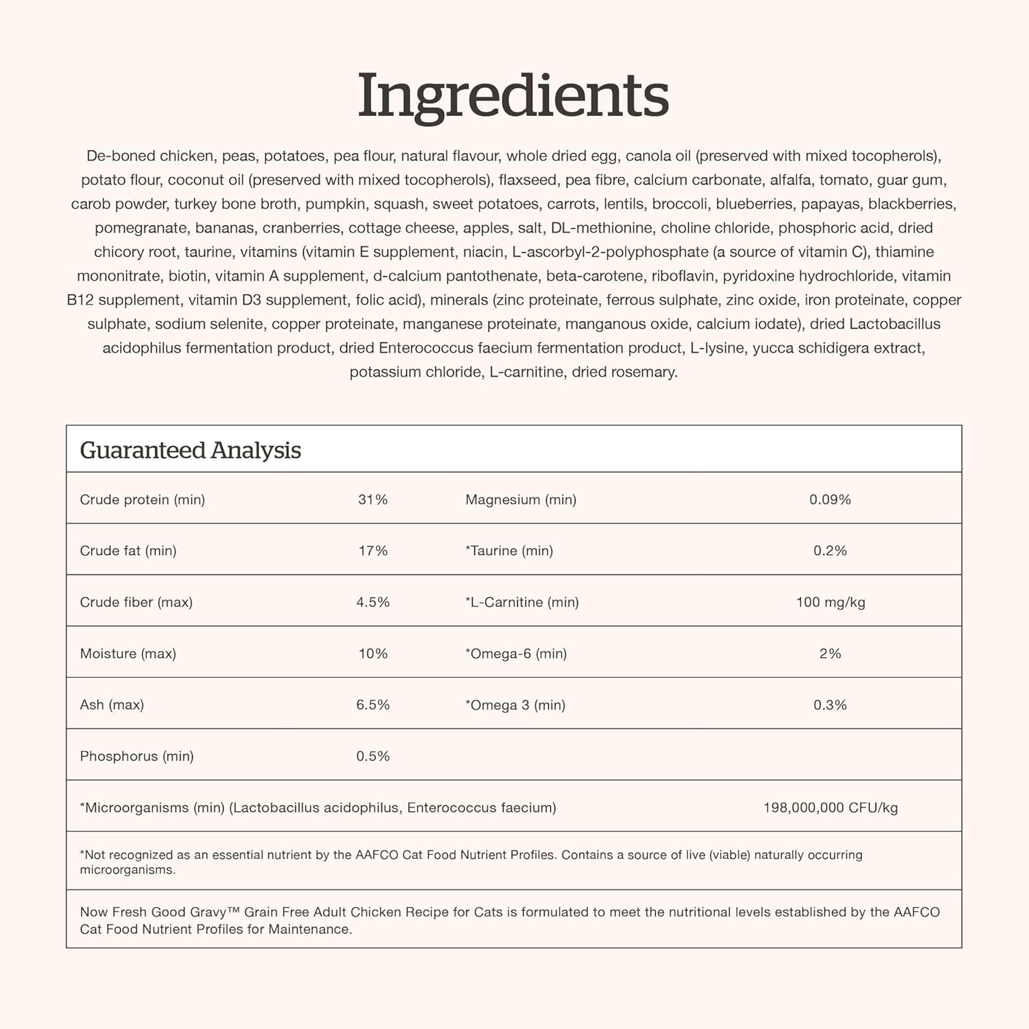 Pamper your cat with a feast fit for a beloved member of the family with our Now Fresh Good Gravy Chicken Recipe, crafted for complete nutrition and yummy flavor for adult and senior cats. Make mealtime exciting by adding water to create a savory, hydrating bone broth gravy. This versatile kibble can be served dry or mixed with warm water to create a yummy experience that's perfect for picky eaters. Featuring tasty, easy-to-digest de-boned chicken as the #1 ingredient, this recipe is formulated with probiotics, fiber-rich pumpkin, sweet potatoes, and flaxseed to support healthy digestion. Plus, antioxidants and essential nutrients from fruits and veggies help maintain a strong immune system. Made simply with minimal processing, this grain-free and gluten-free recipe is crafted without corn, soy, or wheat, using only wholesome ingredients from trusted suppliers. No by-product or meat meals, artificial flavors, colors, or preservatives. You can rest easy knowing that your pet is getting fresh and high-quality ingredients for optimal health and well-being. Made in Canada.