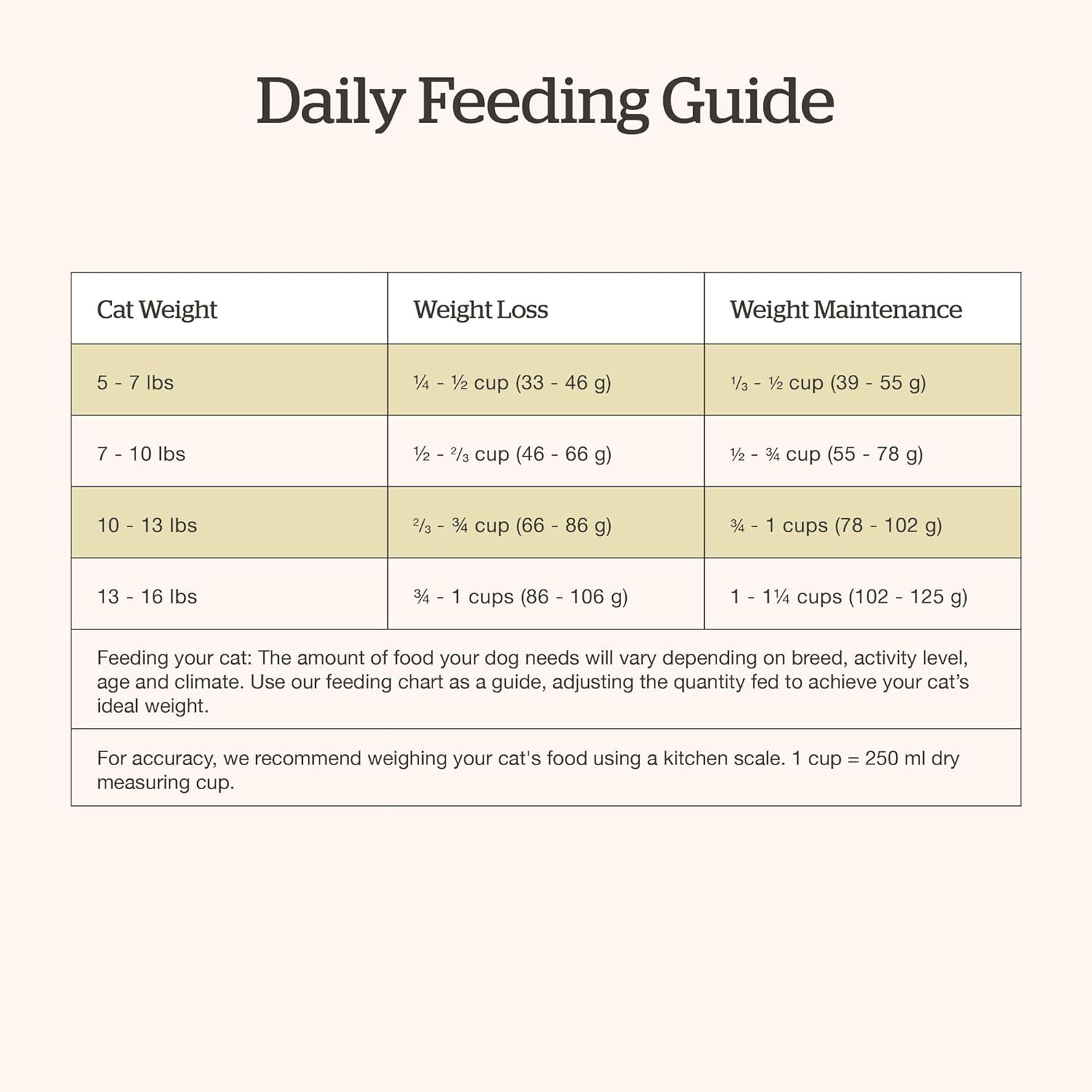 - Directions: The amount of food your cat needs will vary depending on breed, activity level, age and climate. Use our feeding chart as a guide, adjusting the quantity fed to achieve your cat's ideal weight.
