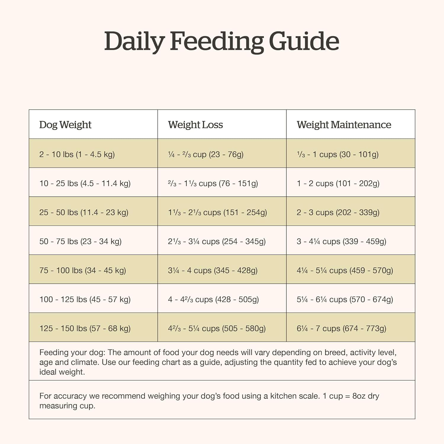 - Directions: The amount of food your dog needs will vary depending on breed, activity level, age and climate. Use our feeding chart as a guide, adjusting the quantity fed to achieve your dog's ideal weight.