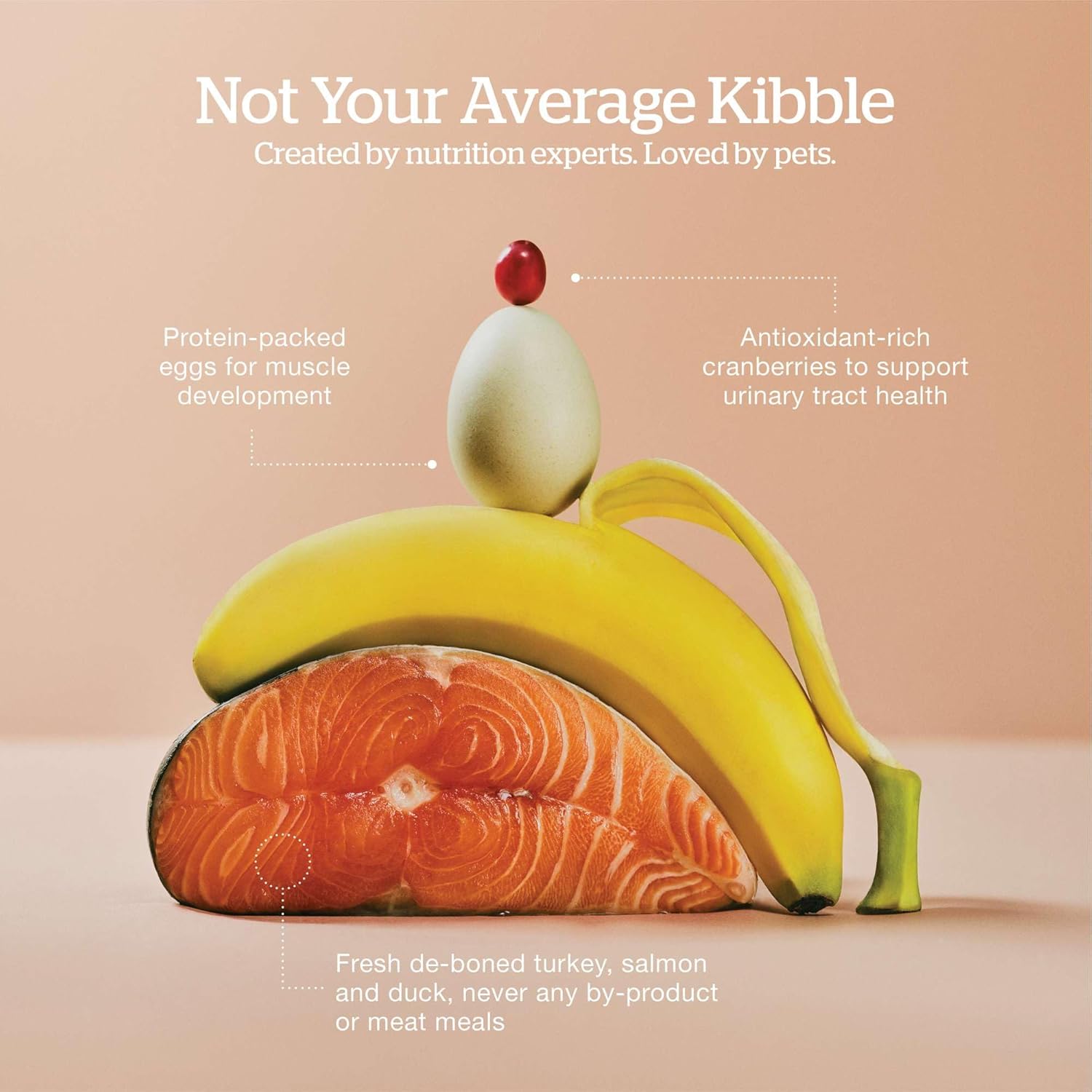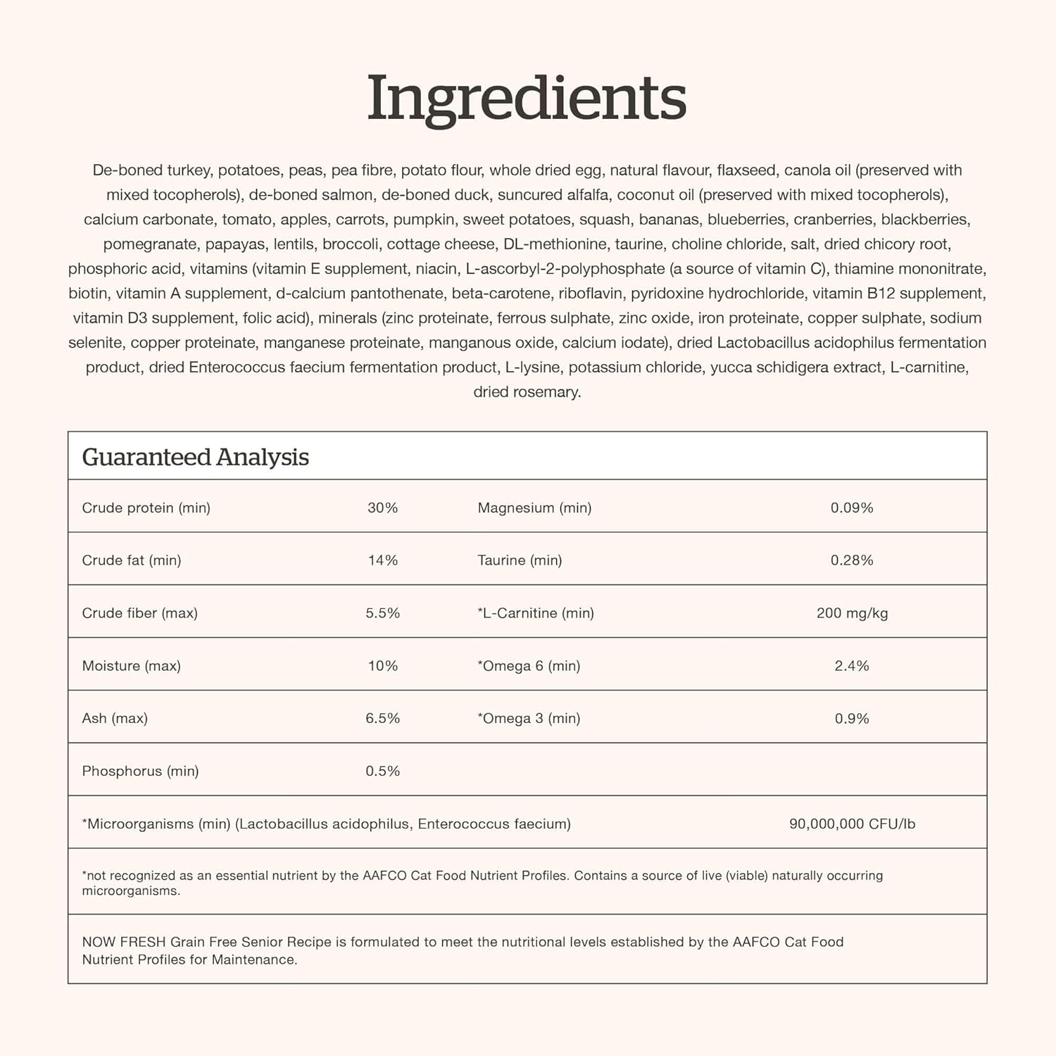 Healthy nutrition is the key to aging gracefully, and we're here to help. Our Now Fresh Grain-Free Senior Recipe with Turkey, Salmon & Duck is tailored to meet your elderly cat's needs, with moderate protein and fat for weight management support and added taurine for maintaining a healthy heart and vision. Featuring a tasty multi-animal protein blend of fresh de-boned turkey, salmon, and duck that's perfect for picky eaters and fussy felines. This chicken-free kibble is formulated with probiotics, fiber-rich pumpkin and sweet potato to support good digestion. Plus, antioxidants and essential nutrients from fruits and veggies help maintain a strong immune system. Made simply with minimal processing, this grain-free and gluten-free recipe is crafted without corn, soy, or wheat, using only wholesome ingredients from trusted suppliers. No by-product or meat meals, artificial flavors, colors, or preservatives. You can rest easy knowing that your pet is getting fresh and high-quality ingredients for optimal health and well-being. Made in Canada.