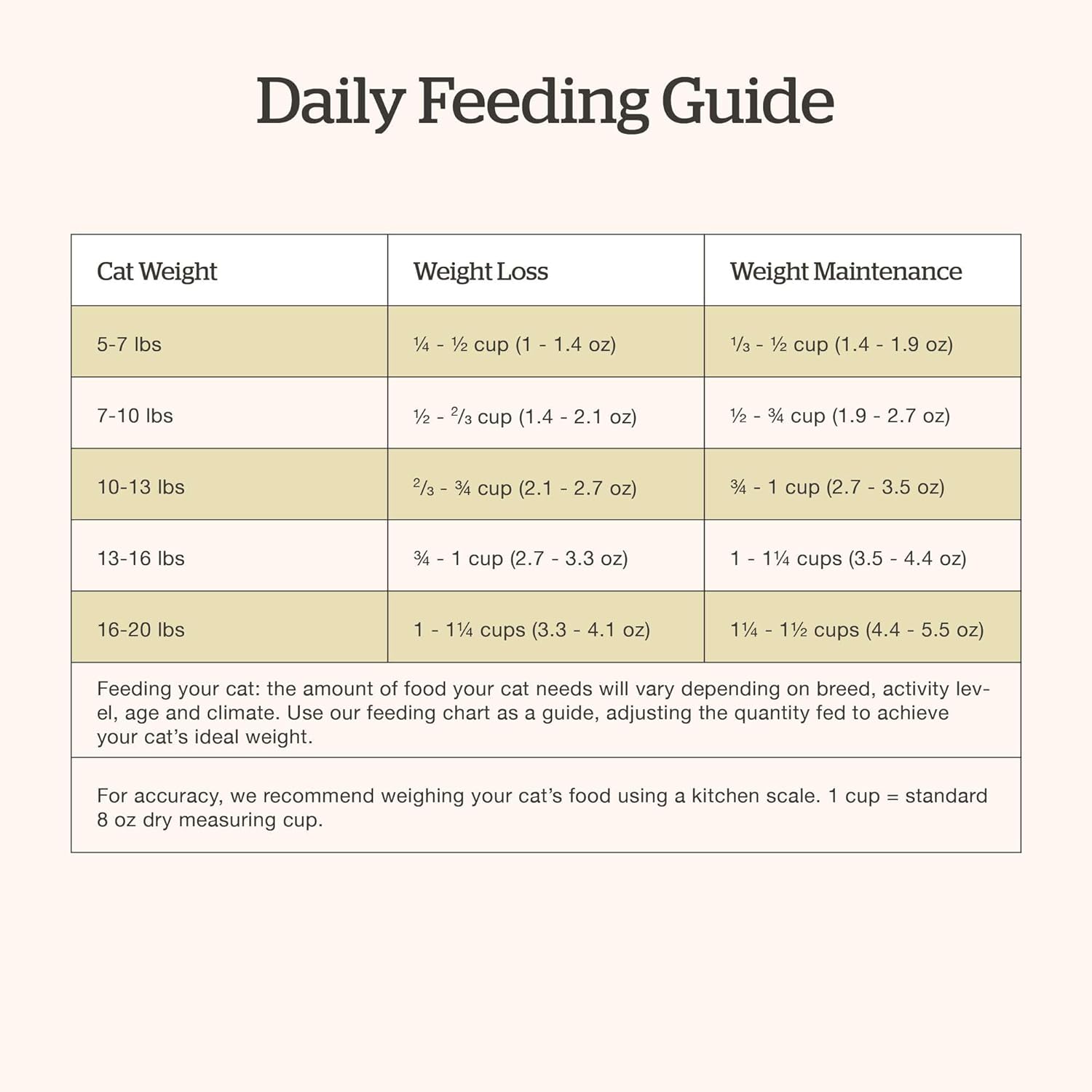 - Directions: The amount of food your cat needs will vary depending on breed, activity level, age and climate. Use our feeding chart as a guide, adjusting the quantity fed to achieve your cat's ideal weight.