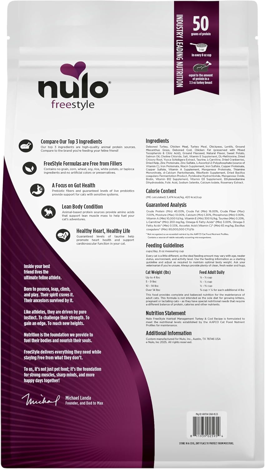 Fuel Incredible™ with Nulo FreeStyle Hairball Turkey & Cod Recipe, a high-protein dry cat food specially formulated to aid minimizing hiarball formation. Made with 83% animal-based protein, this grain-free cat food features real pollock as the #1 ingredient, delivering essential amino acids to help maintain lean muscle mass and energy levels. This nutrient-rich cat food includes prebiotic fiber and guaranteed BC30 probiotics for digestive and immune health, while omega-3 and omega-6 fatty acids promote a healthy skin and coat. With taurine for heart health and L-carnitine for weight management, every bite fuels your cat’s inner athlete. Made without grains, corn, wheat, soy, white potatoes, or tapioca, Nulo's natural cat food for hairball management provides premium cat nutrition without fillers or artificial preservatives. Thanks to it's small, disc shaped kibble, each bite promotes proper chewing and healthy digestion. Trust Nulo FreeStyle to provide the best natural cat food for hairball control—so your feline can stay active, comfortable, and ready for adventure.
