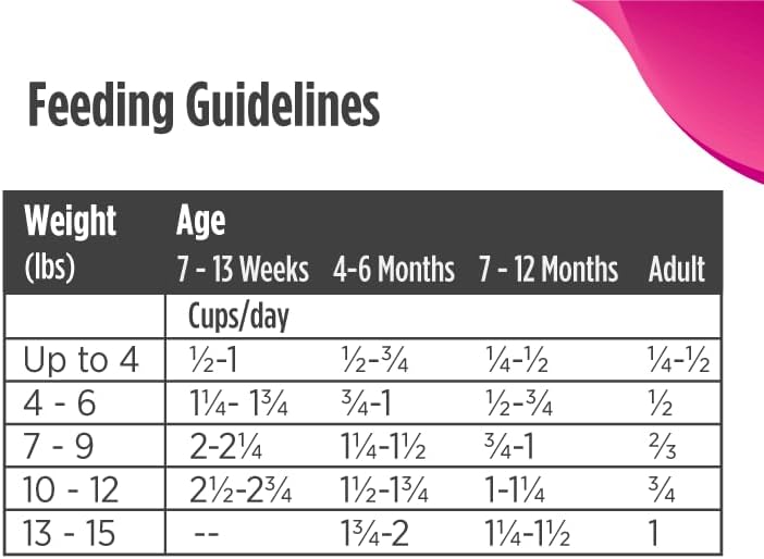 - Directions: Every cat is a little different, so the ideal feeding amount may vary with age, neuter status, environment and activity level. Use the feeding information as a starting guideline and adjust as required to maintain optimal body weight. Ask your veterinarian if you're unsure. Always provide plenty of clean, fresh water and hugs. Cat Feeding Guidelines (cups/day (8 oz measuring cup)) Up to 4 lbs • 7–13 weeks ⅓ – ⅔ cup • 4–6 months ⅓ – ½ cup • 7–12 months ¼ – ⅜ cup • Adult ¼ – ⅓ cup 4-6 lbs • 7–13 weeks ⅔ – ¾ cup • 4–6 months ½ – ¾ cup • 7–12 months ⅜ – ½ cup • Adult ⅓ – ⅜ cup 7-9 lbs • 7–13 weeks ¾ – 1 cup • 4–6 months ¾ – ⅞ cup • 7–12 months ⅔ – ¾ cup • Adult ⅜ – ½ cup 10-12 lbs • 7–13 weeks 1 – 1¼ cups • 4–6 months 1 – 1⅛ cups • 7–12 months ¾ – ⅞ cup • Adult ½ – ⅝ cup 13-15 lbs • 7–13 weeks 1¼ – 1½ cups • 4–6 months 1⅛ – 1¼ cups • 7–12 months ⅞ – 1 cup • Adult ⅝ – ¾ cup Nursing & Pregnant Mothers Feed up to three times the amount shown in the Adult column.