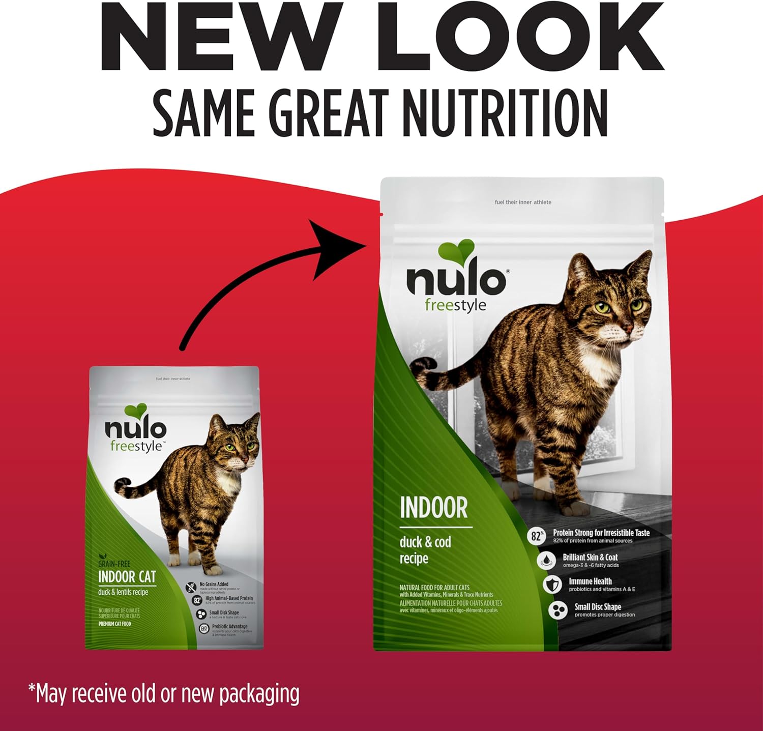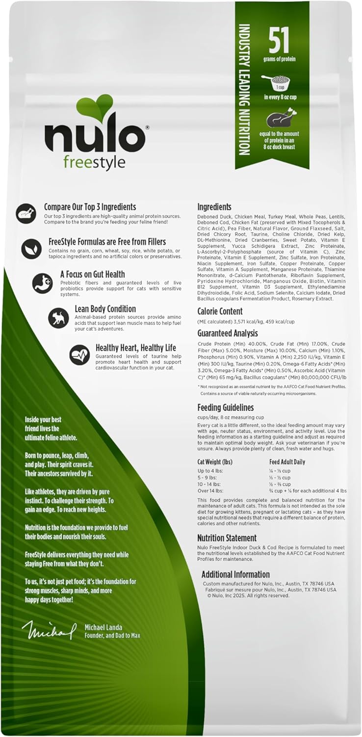 Fuel Incredible™ with Nulo FreeStyle Indoor Duck & Cod Recipe, a high-protein natural cat food designed specifically for indoor cats. Made with 82% animal-based protein, this grain-free recipe features real deboned duck as the #1 ingredient, delivering essential amino acids to support lean muscles, strength, and agility. Formulated to promote skin, coat, digestive, and immune health, this nutrient-rich recipe includes omega-3 and omega-6 fatty acids to support a soft, shiny coat, while prebiotic fiber and BC30 probiotics help maintain healthy digestion and immune function. Guaranteed taurine levels support heart health and vision, ensuring your cat gets complete, balanced nutrition. Made without grains, corn, wheat, soy, white potatoes, or tapioca, Nulo’s natural indoor cat food provides grain-free nutrition without fillers or artificial preservatives. Plus, its small, disc-shaped kibble encourages proper chewing and healthy digestion. Trust Nulo FreeStyle to fuel your cat’s inner athlete with the best natural indoor cat food—for more happy, healthy days together.