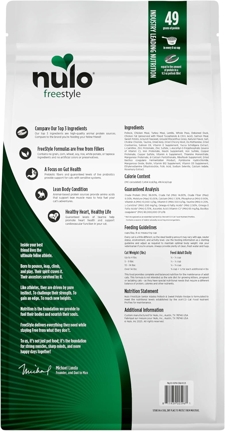 Fuel Incredible with Nulo FreeStyle Senior Cat Food Alaska Pollock & Sweet Potato Recipe, a high-protein dry cat food specially formulated to support aging cats. Made with 78% animal-based protein, this grain-free cat food features real pollock as the #1 ingredient, delivering essential amino acids to help maintain lean muscle mass and energy levels. Formulated for complete senior cat nutrition, this nutrient-dense recipe includes omega-3 and omega-6 fatty acids to promote skin and coat health, while prebiotic fiber and BC30 probiotics aid digestion and immune function. Plus, guaranteed taurine levels support heart health and vision function, while L-carnitine promotes healthy weight management. Made without grains, corn, wheat, soy, white potatoes, or tapioca, Nulo’s natural senior cat food provides premium cat nutrition without fillers or artificial preservatives. With its small, disc-shaped kibble designed for proper chewing and digestion, every bite helps support your senior cat’s best years. Trust Nulo FreeStyle to fuel your senior cat’s inner athlete with the best natural senior cat food—for more happy, healthy days together.