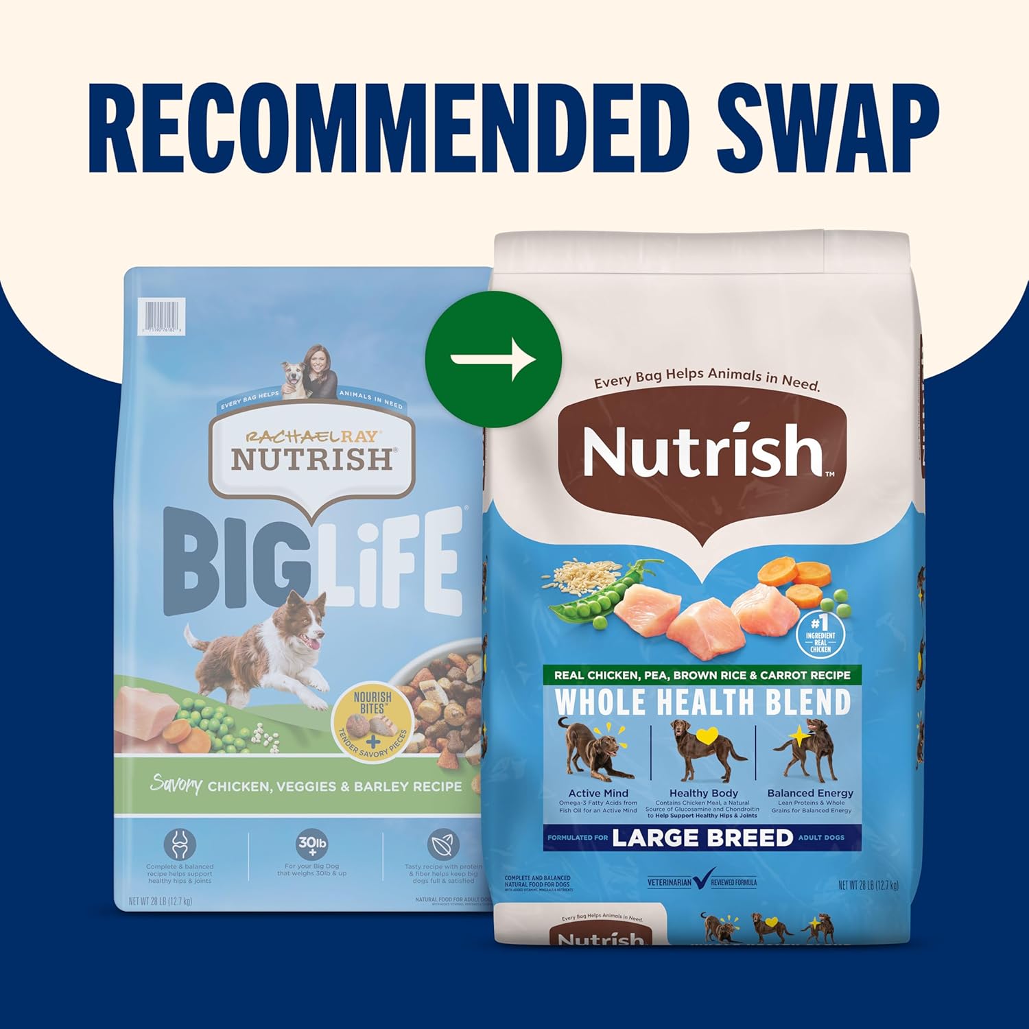 Check out this tasty and nutritious large breed dog food. Nutrish Large Breed Real Chicken, Pea, Carrot & Brown Rice Recipe is made with real chicken as the #1 ingredient, a good source of protein to help support lean muscle mass and healthy organs. Specially crafted large breed dog food with chicken meal to provide a natural source of glucosamine and chondroitin to help support healthy hips and joints. This Whole Health Blend recipe supports your dog’s active mind, healthy body, and balanced energy—perfect for helping your big buddy thrive. Your dog will love the delicious flavor of chicken dog food, and you’ll feel great knowing that a portion of every purchase goes to The Rachael Ray Foundation to help animals in need. So go ahead, treat your large breed dog to a meal they’ll love and make a difference at the same time.