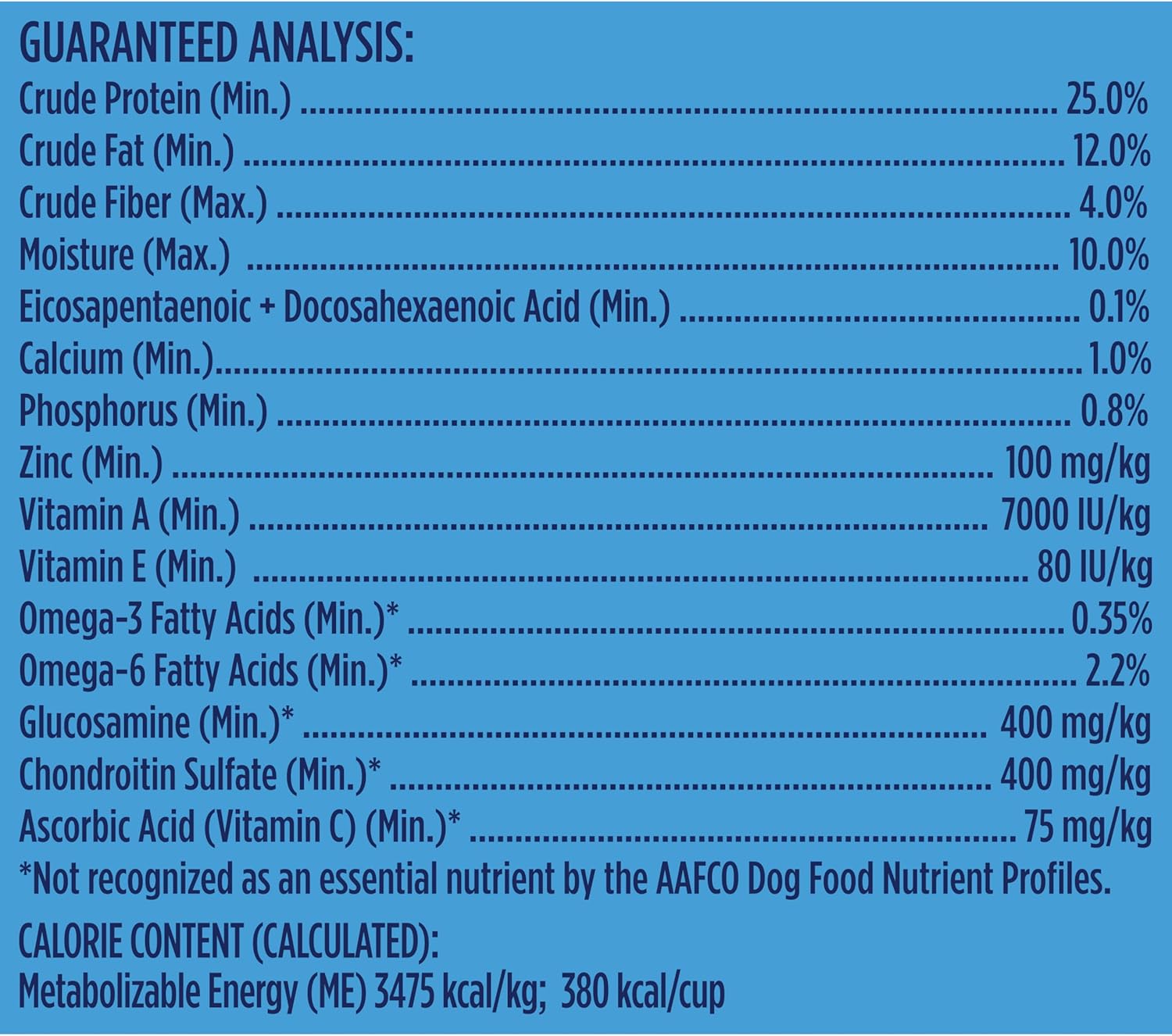- Directions: ADULT DOG SIZE DAILY FEEDING AMOUNT* 4 - 14 lbs 1/2 to 1 cup 15 - 28 lbs 1 1/4 to 1 3/4 cups 29 - 50 lbs 2 to 2 3/4 cups 51 - 101lbs 3 to 4 3/4 cups Over 101lbs 5 plus 1/2 cup for every additional 12 lbs. *Amounts are based on a standard 8 oz. dry measuring cup. This chart represents average recommended daily portions. You may need to feed slightly more or less, depending on your dog's activity level and overall fitness. Adult dogs with normal activity may be fed the recommended amount in two meals daily. Depending on your dog's age and activity level, serving sizes may vary slightly from the recommended daily feeding guide portions. Water - Be sure to provide plenty of fresh, clean water daily.